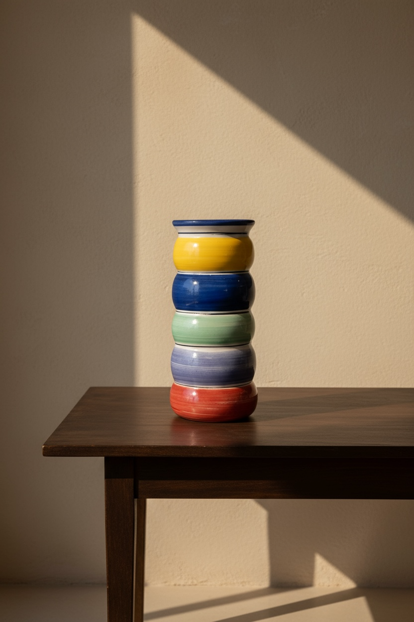 Candelabro de cerámica artesanal en barro rojo, pintado a mano con motivos concéntricos en azul cobalto, naranja y amarillo. La...