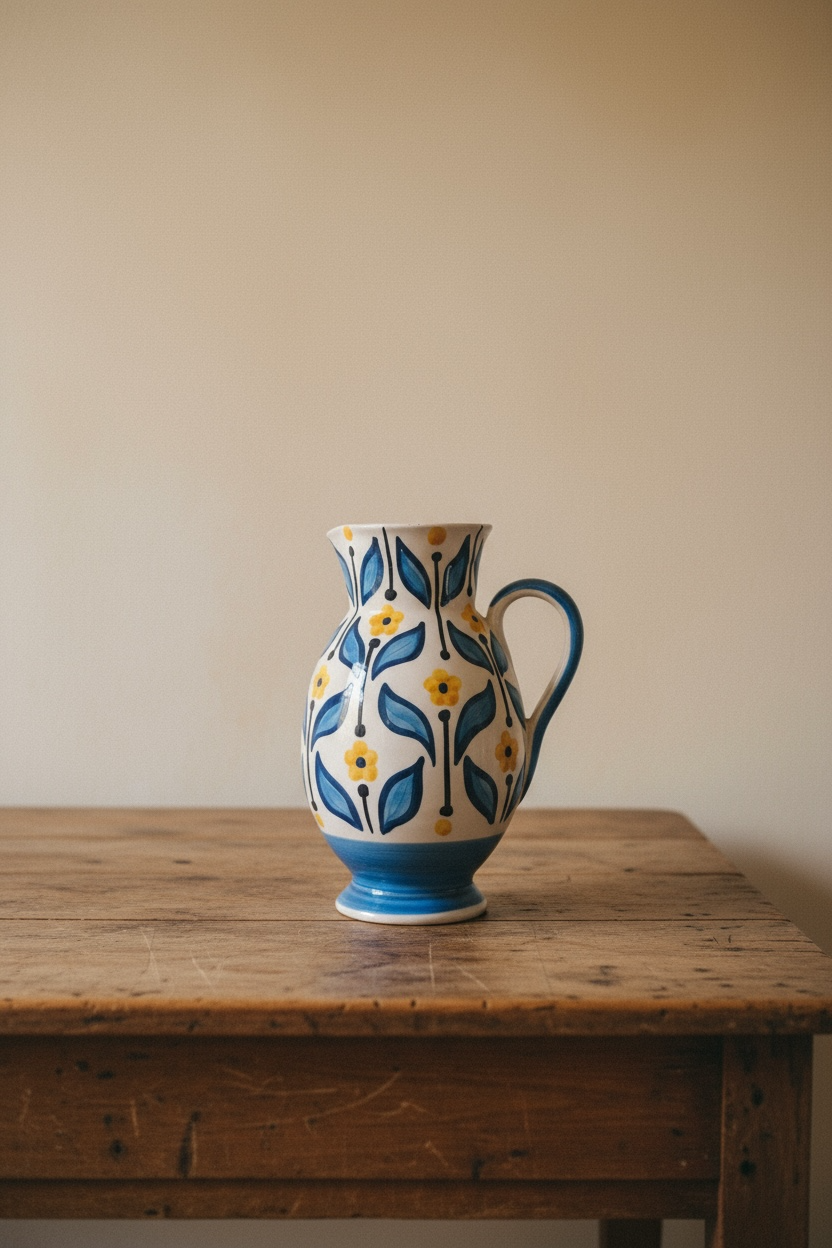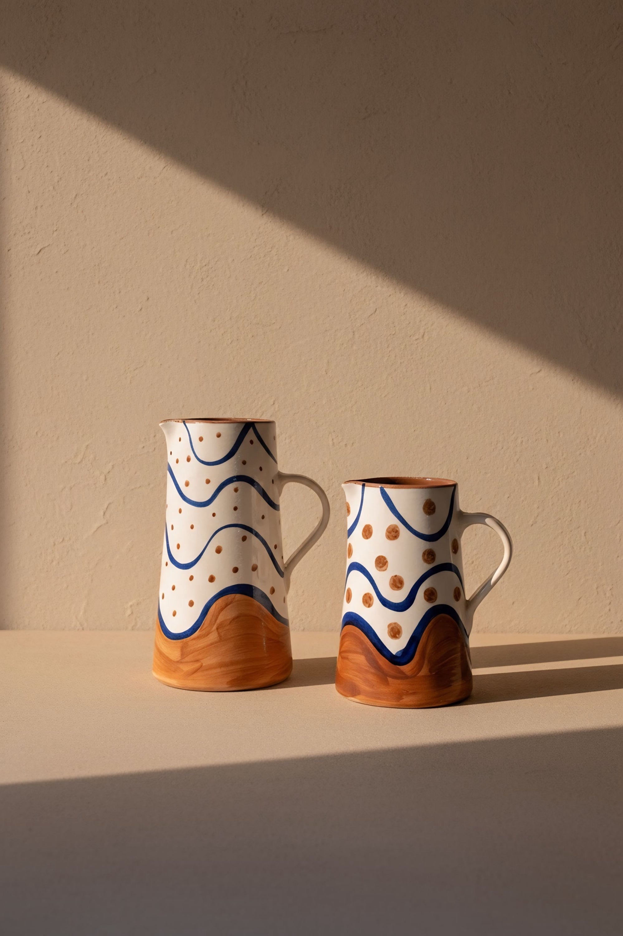 Aceitera de cerámica artesanal en barro rojo, esmaltada a mano en tonos tierra y ocres. El trazo pictórico orgánico convierte...