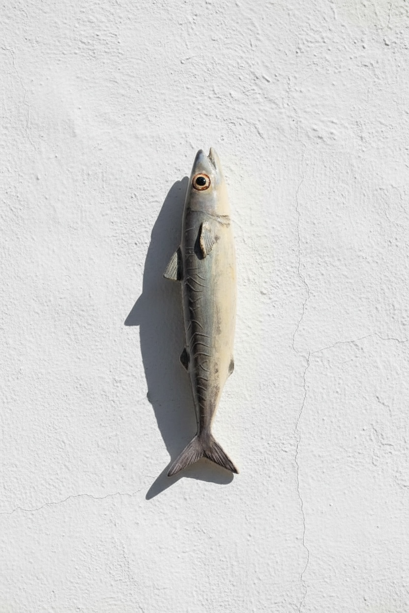 Cerámica modelada y esmaltada a mano. El cuerpo alargado y el acabado nacarado reproducen los reflejos naturales del pez. Puede colgarse o apoyarse sobre superficies.