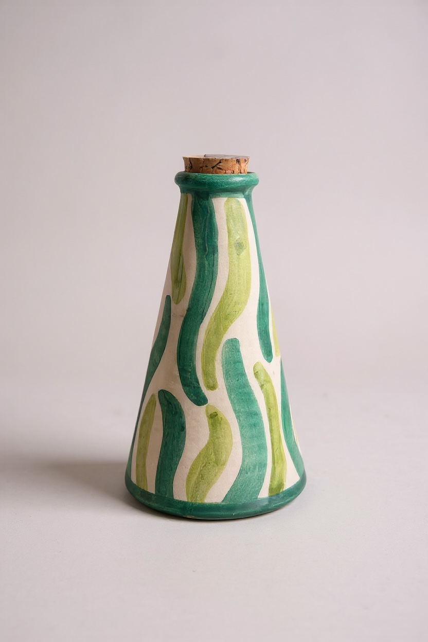 Aceitera de cerámica artesanal en barro rojo, con decoración pintada a mano en tonos verdes y trazos orgánicos que evocan movimiento. Su forma cónica estilizada refuerza el carácter escultórico de la pieza. Parte del Drop 2 de Bite Me, and I’m Yours, realizada en España.