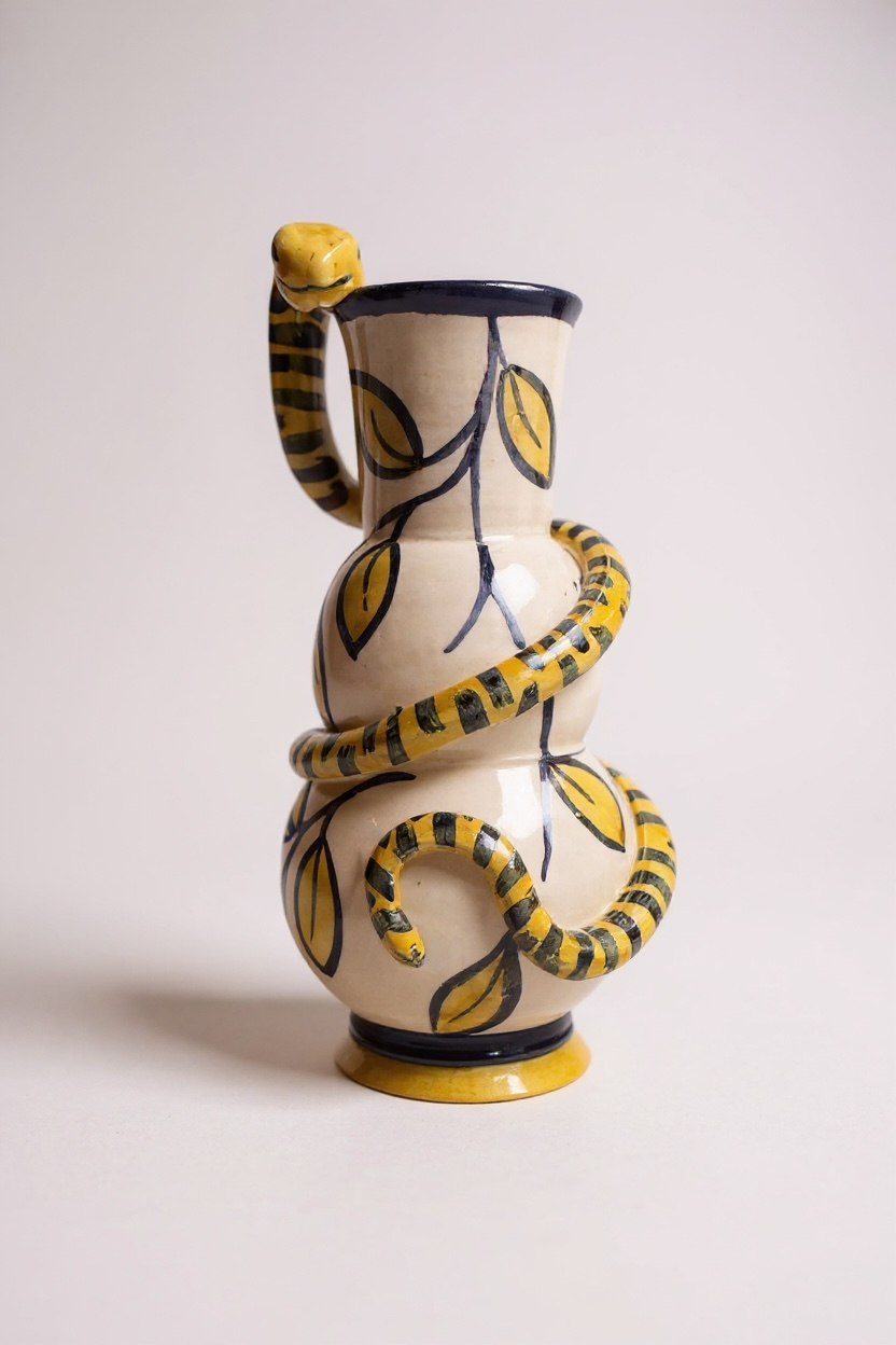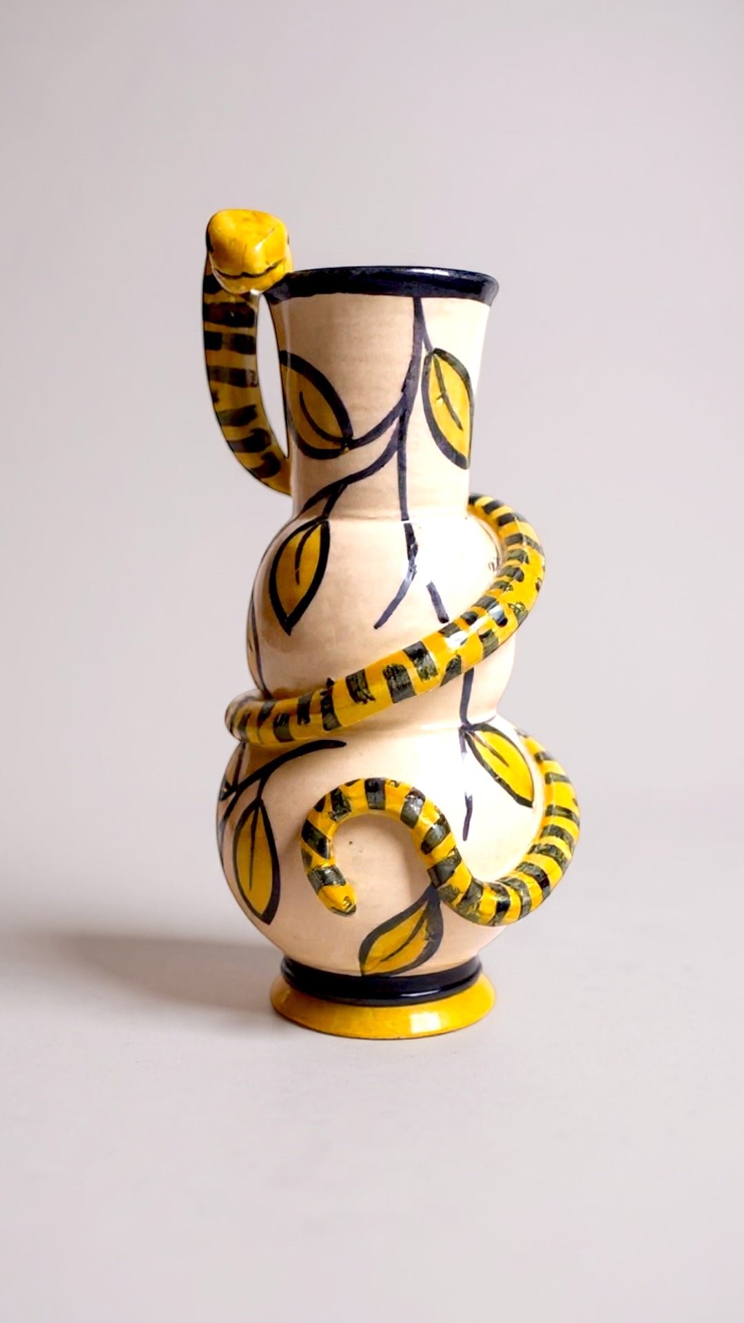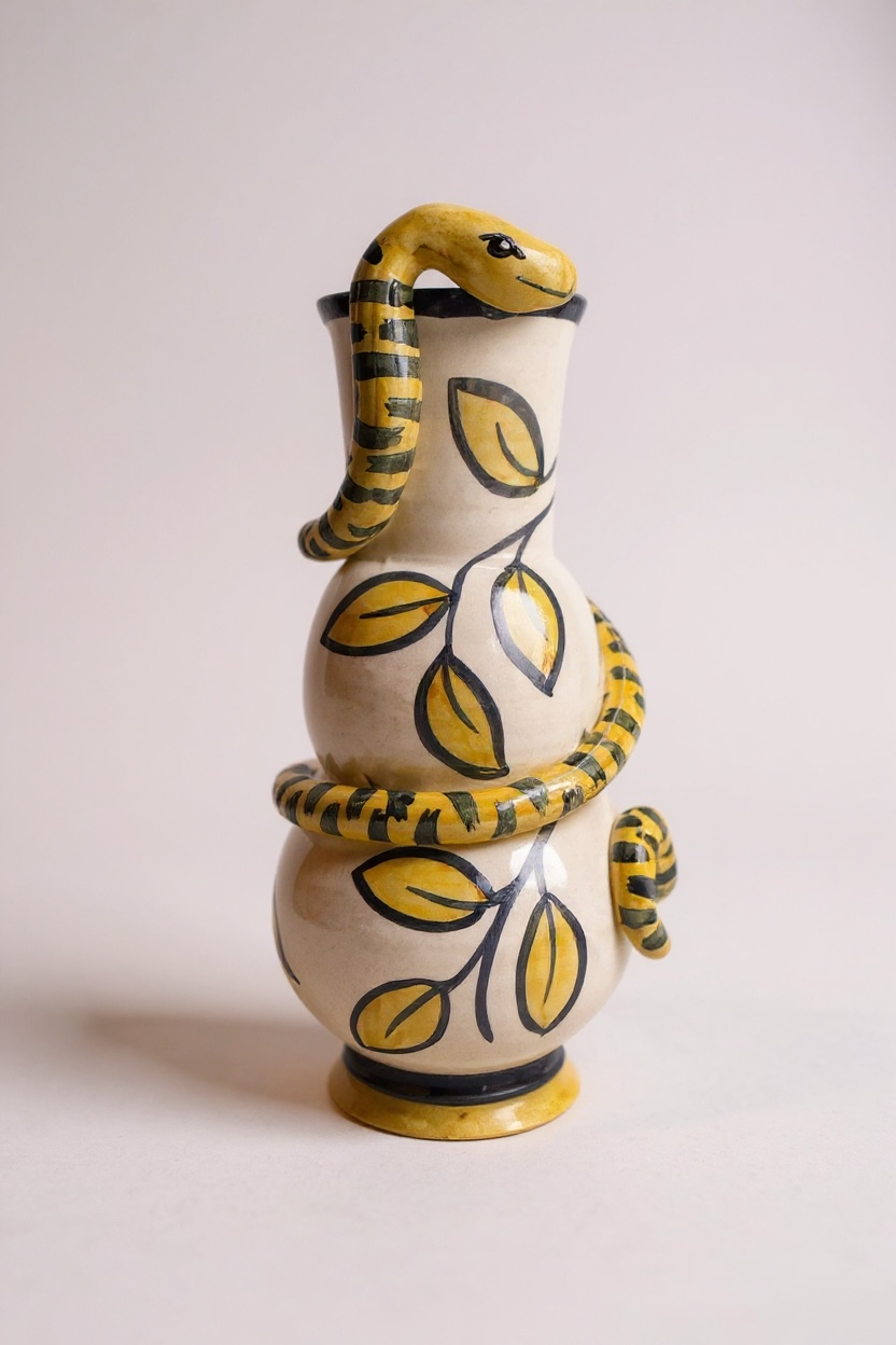 Jarrón de cerámica artesanal en barro rojo, pintado a mano en blanco con motivos vegetales en negro y amarillo. Una serpiente esmaltada en tonos amarillos y negros recorre la silueta, aportando movimiento y simbolismo a la pieza. Su carácter escultórico lo convierte en objeto decorativo más allá de su función. Pertenece al Drop 2 de Bite Me, and I’m Yours, elaborado en España.
