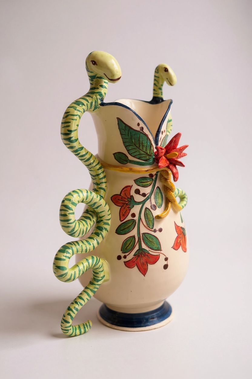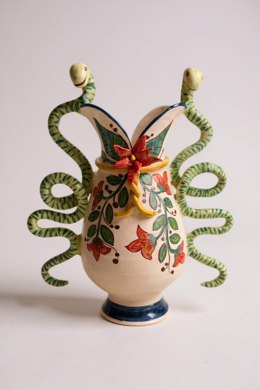 Jarrón de cerámica artesanal en barro rojo, con asas en forma de serpientes esmaltadas en verde que se extienden en curvas simétricas a ambos lados de la pieza. La superficie está pintada a mano con motivos florales en tonos rojos y verdes, con un relieve central en forma de flor. La combinación de volumen escultórico y detalle pictórico otorga a la obra una presencia única. Realizado en España como parte del Drop 2 de Bite Me, and I’m Yours.