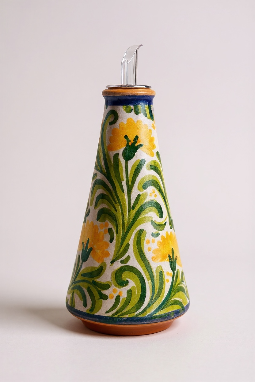 Aceitera artesanal de barro rojo, torneada y pintada a mano con decoración floral en tonos amarillos y verdes. La silueta cónica y el esmaltado brillante otorgan carácter y luminosidad a la pieza.