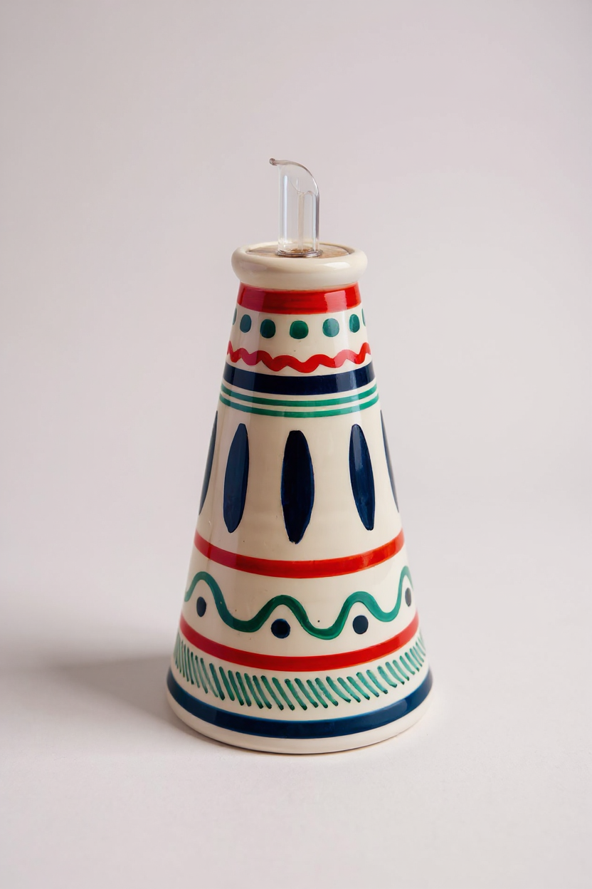 Aceitera de cerámica artesanal pintada a mano, elaborada en barro rojo con silueta cónica. Su decoración en verdes, azules y rojos recuerda los tonos cálidos y cambiantes de un atardecer mediterráneo. El esmalte brillante aporta un acabado refinado y atemporal.