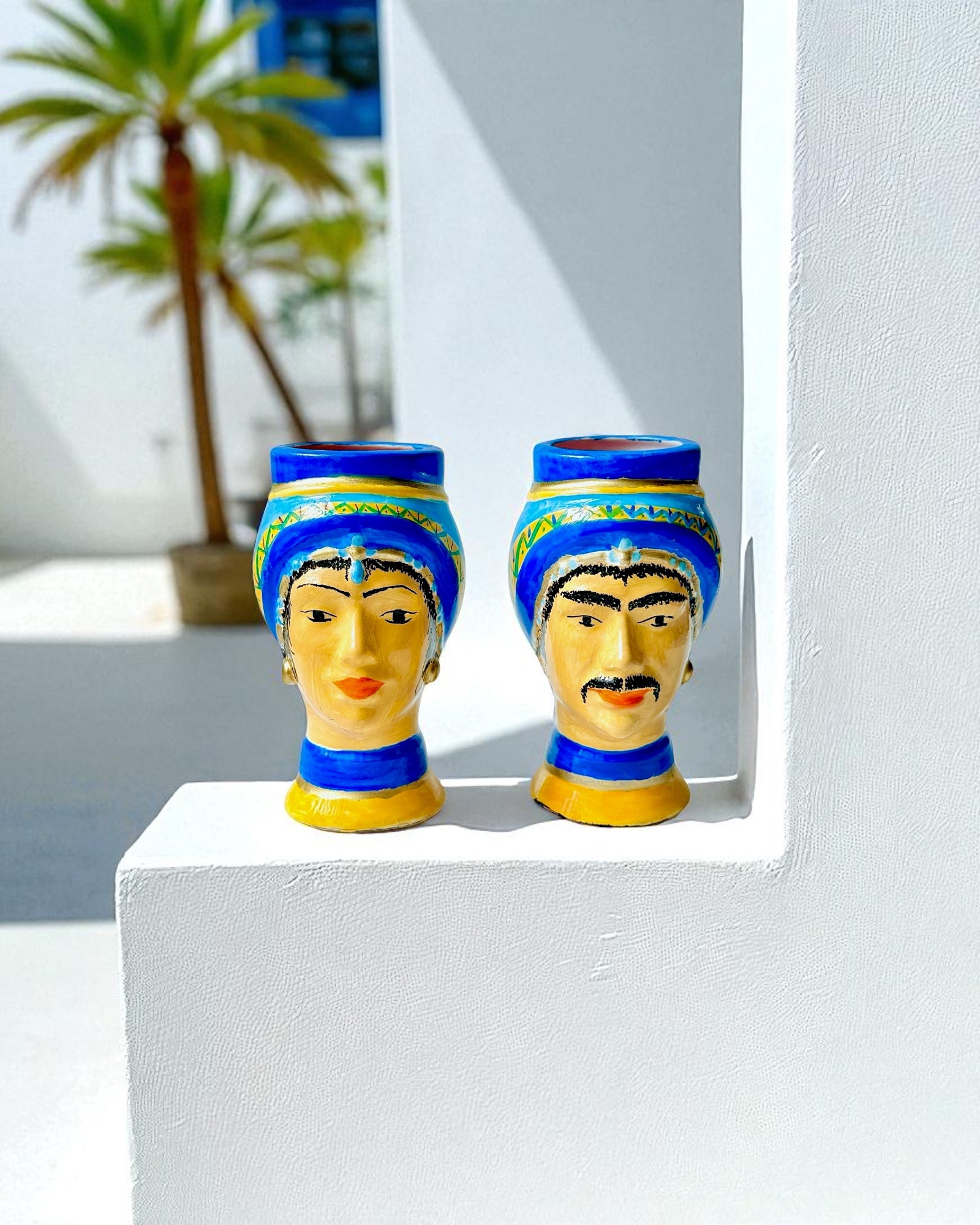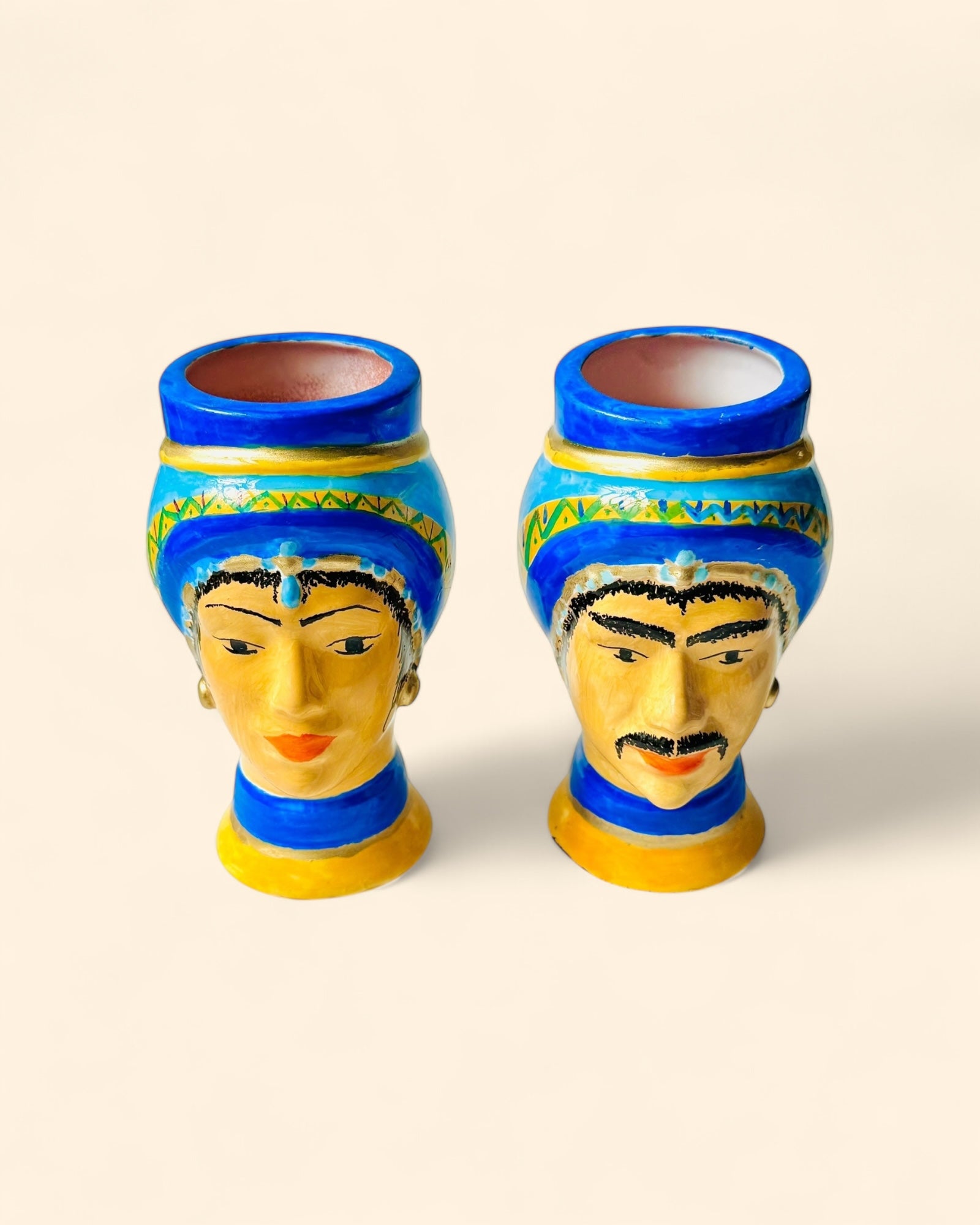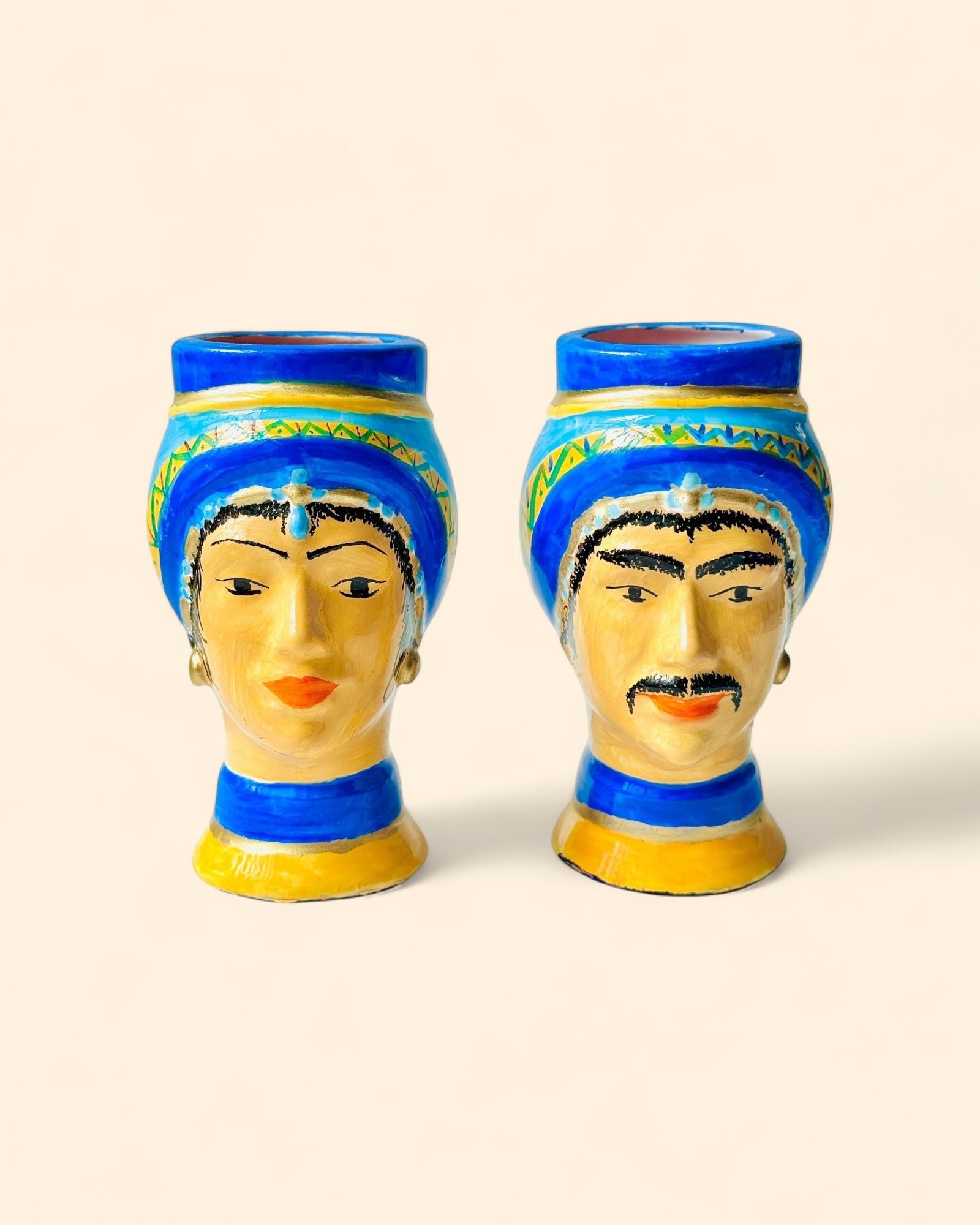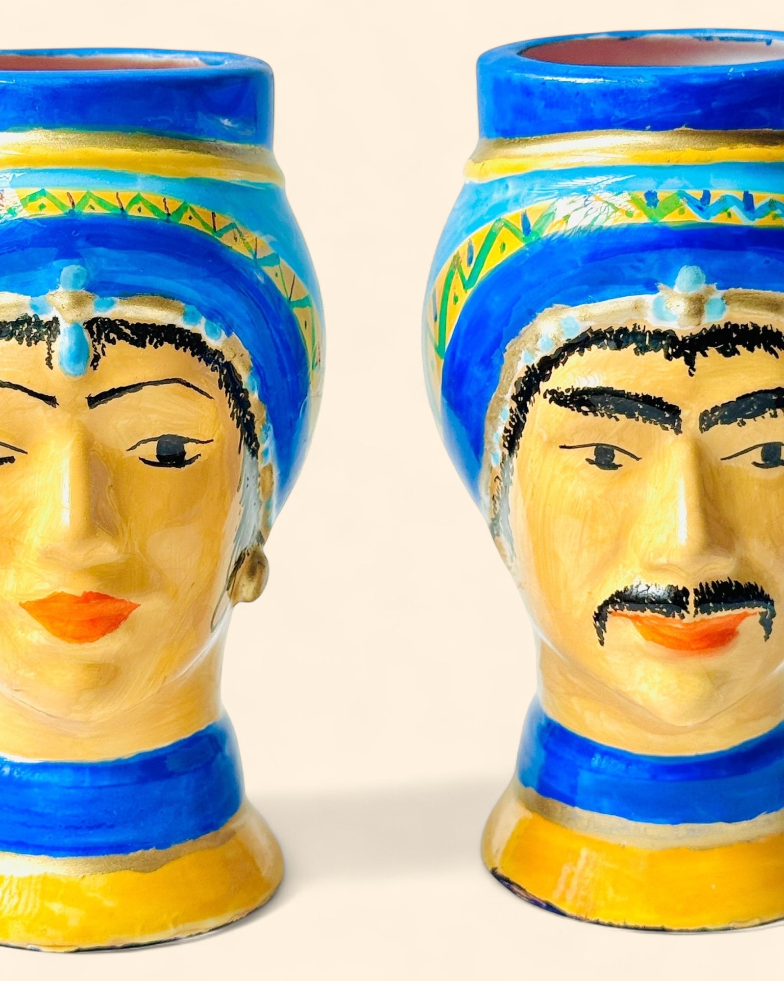 Pareja de bustos en cerámica pintada a mano, inspirados en las figuras tradicionales mediterráneas. Cada pieza presenta un turbante azul intenso con detalles geométricos y una base en ocre dorado, realzando los rasgos expresivos de los rostros. Ideales como piezas decorativas o para uso como jarrón de boca ancha.