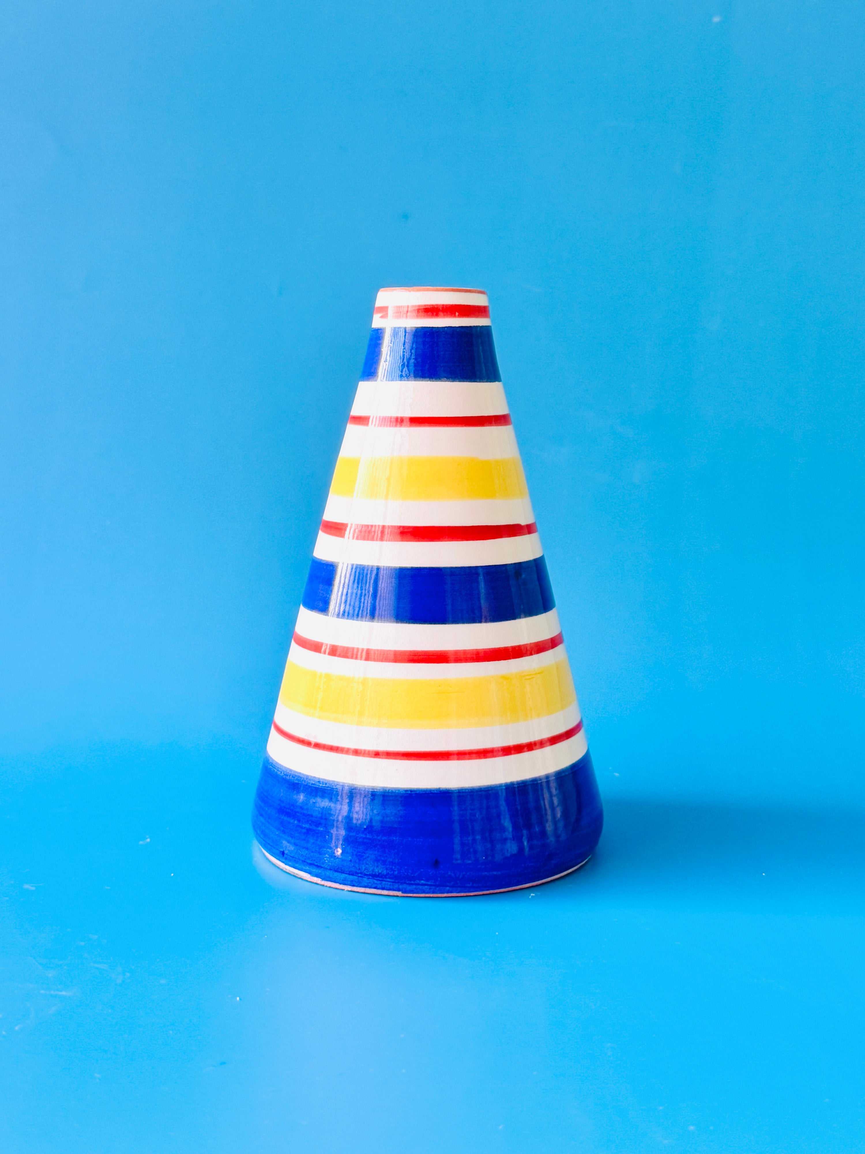 Pieza decorativa de pared realizada a mano en Madrid sobre barro rojo, esmaltada y pintada con vivos contrastes cromáticos. Su silueta estilizada y el trabajo detallado de las aletas evocan el movimiento del mar, mientras que los acabados brillantes refuerzan la intensidad de los colores.