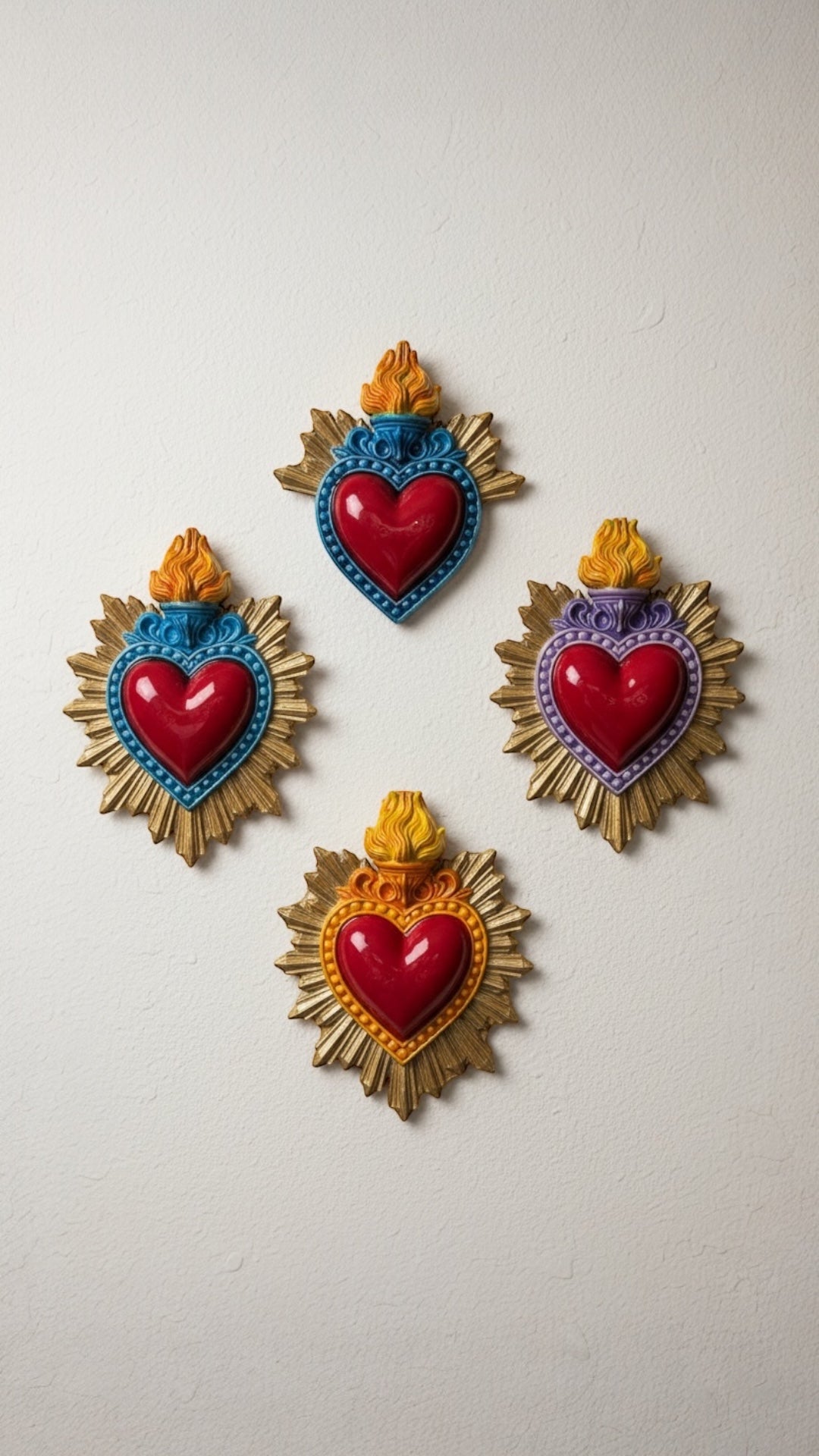 Exvoto corazón radiante · Relieve escultórico en cerámica esmaltada
