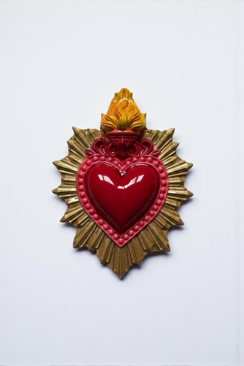 Exvoto con corazón central esmaltado en rojo intenso sobre marco radial en tono dorado.