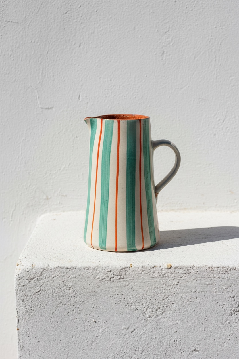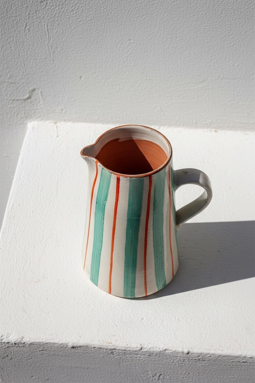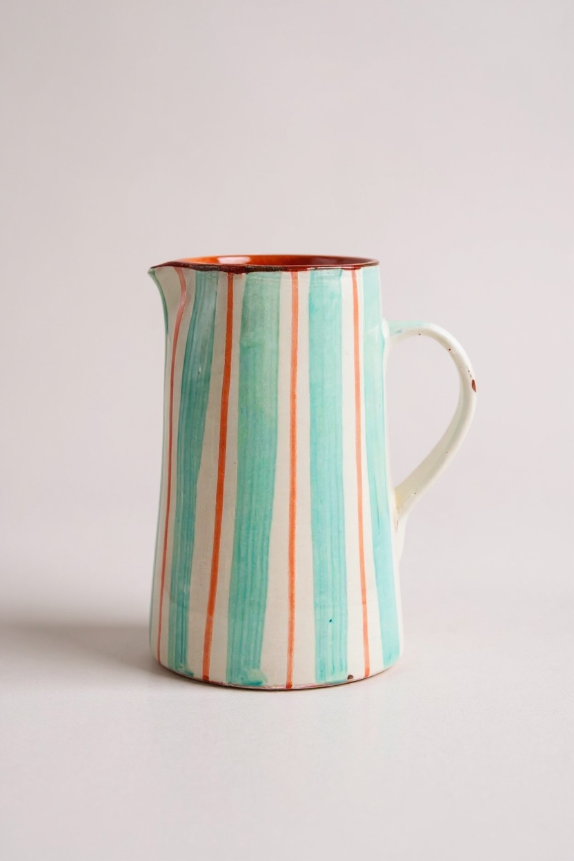 Jarra funcional y decorativa realizada a mano en barro rojo, modelada en el torno y pintada a mano. Cada pieza presenta variaciones propias del proceso manual, lo que la convierte en un objeto único.