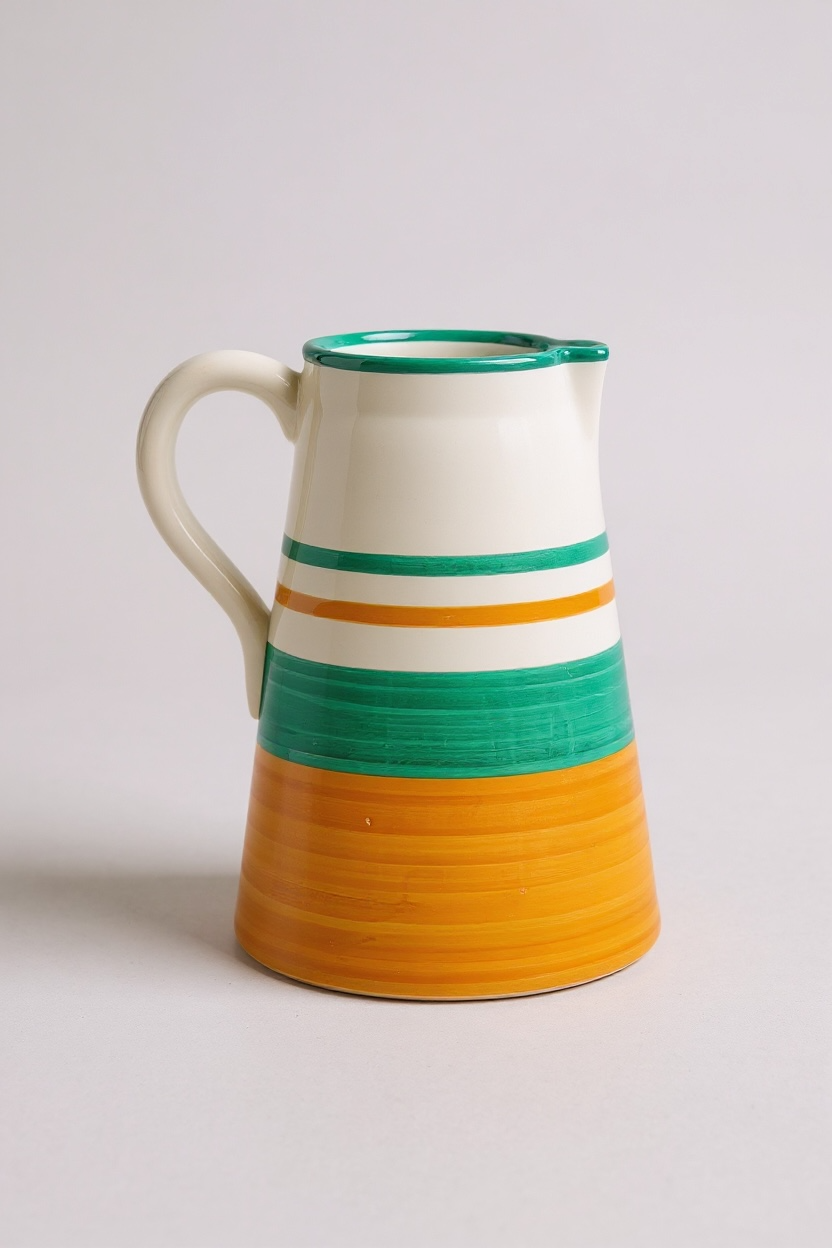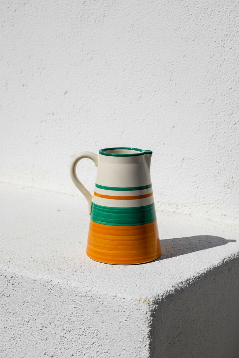 Jarra funcional y decorativa realizada a mano en barro rojo, modelada en el torno y pintada a mano. Cada pieza presenta variaciones propias del proceso manual, lo que la convierte en un objeto único.