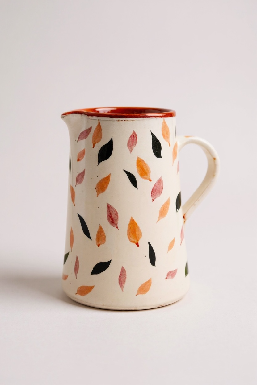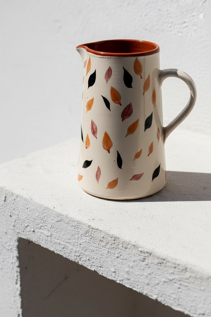 Jarra funcional y decorativa realizada a mano en barro rojo, modelada en el torno y pintada a mano. Cada pieza presenta variaciones propias del proceso manual, lo que la convierte en un objeto único.