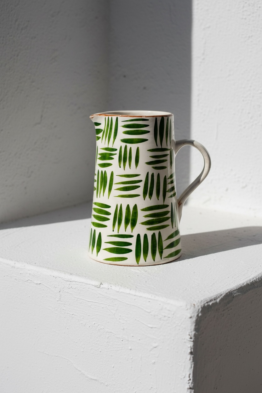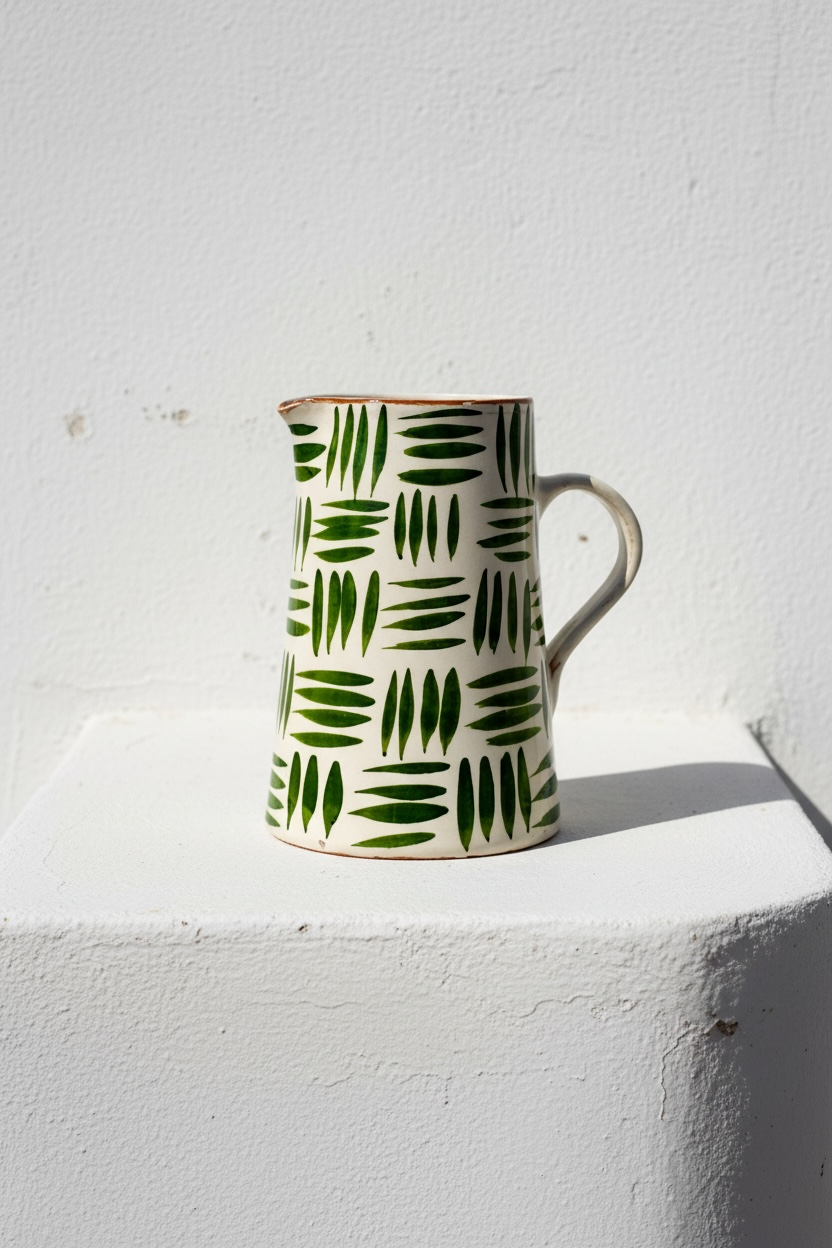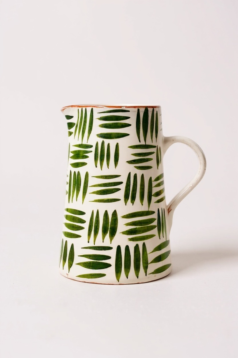Jarra funcional y decorativa realizada a mano en barro rojo, modelada en el torno y pintada a mano. Cada pieza presenta variaciones propias del proceso manual, lo que la convierte en un objeto único.