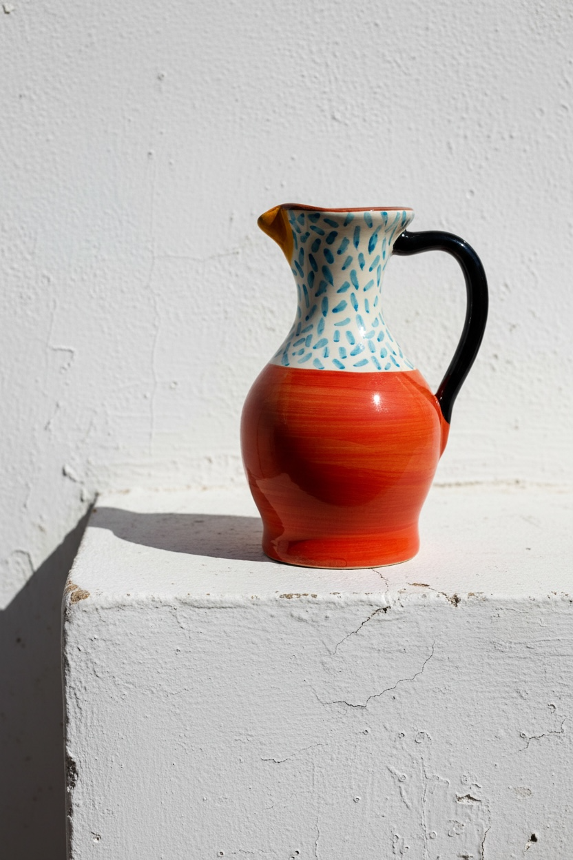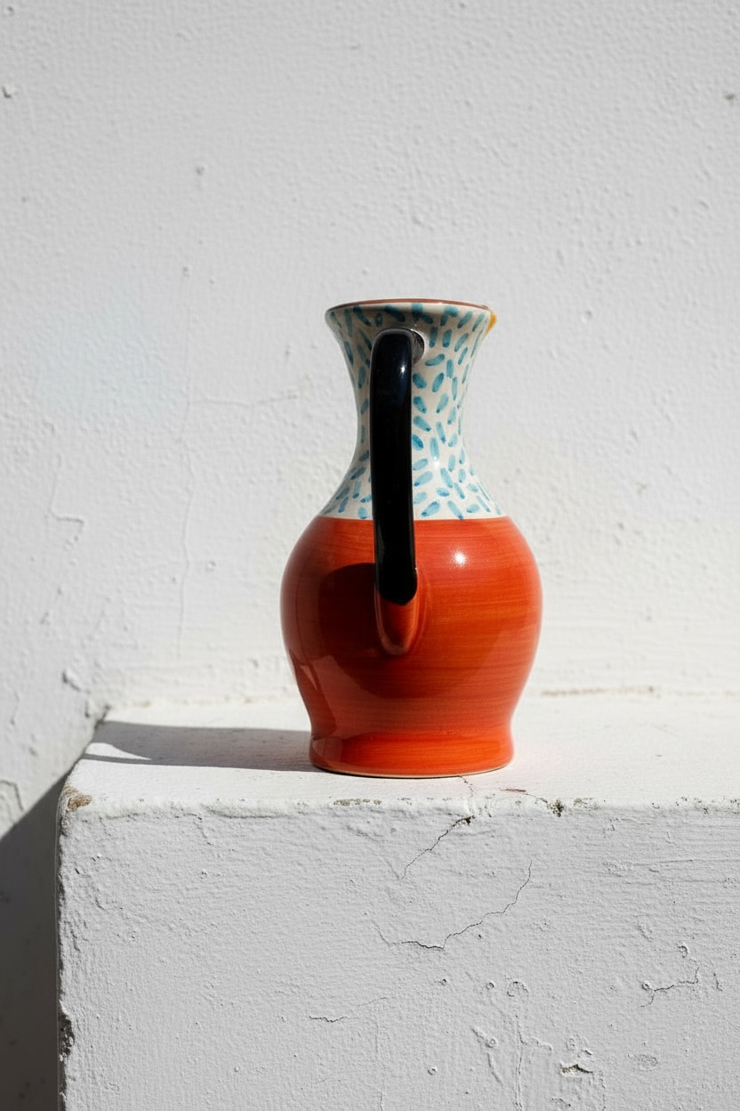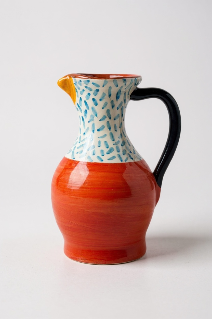 Jarra funcional y decorativa realizada a mano en barro rojo, modelada en el torno y pintada a mano. Cada pieza presenta variaciones propias del proceso manual, lo que la convierte en un objeto único.