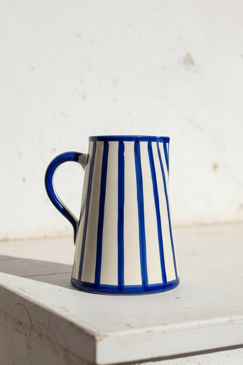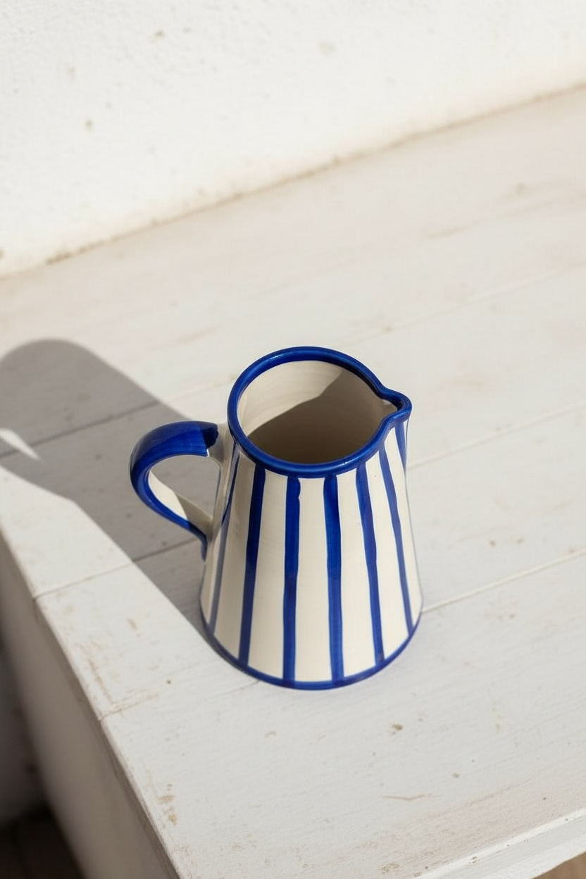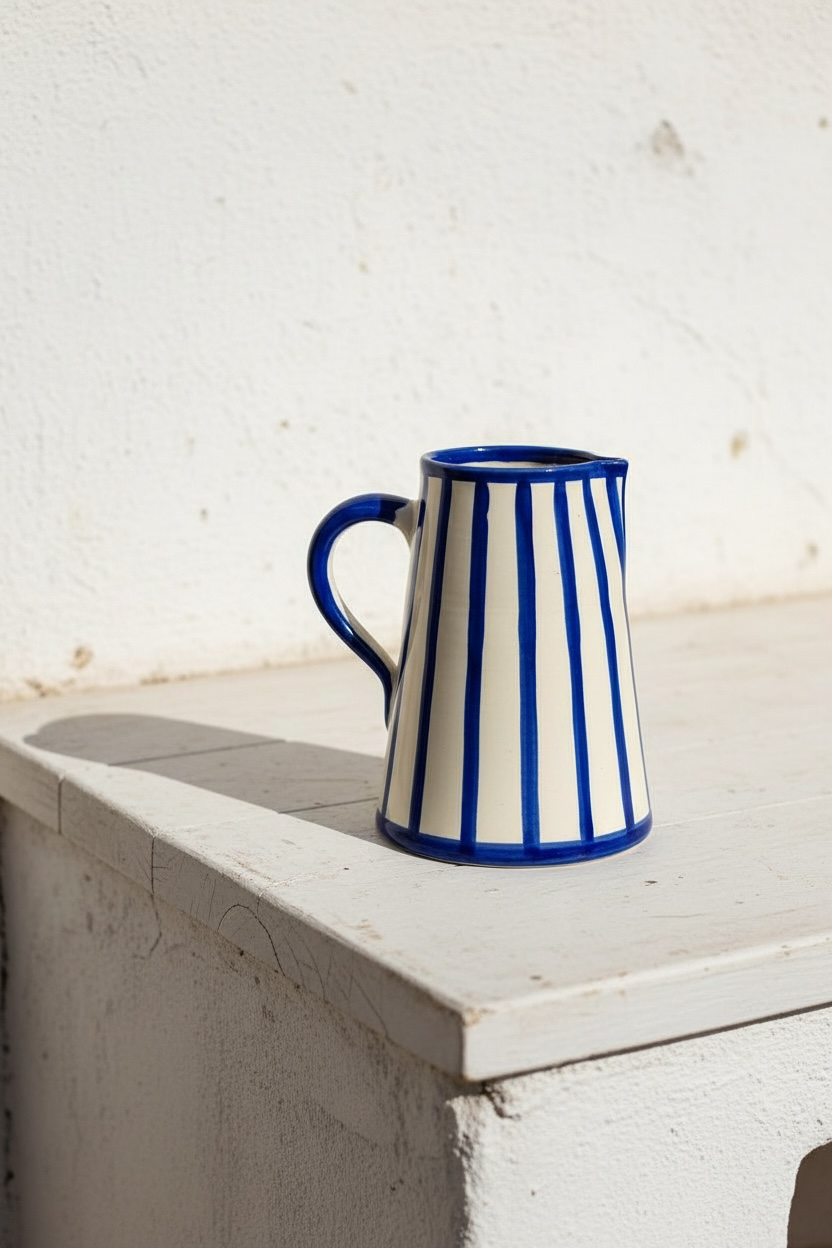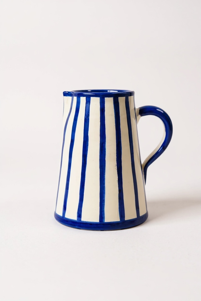 Jarra funcional y decorativa realizada a mano en barro rojo, modelada en el torno y pintada a mano. Cada pieza presenta variaciones propias del proceso manual, lo que la convierte en un objeto único.