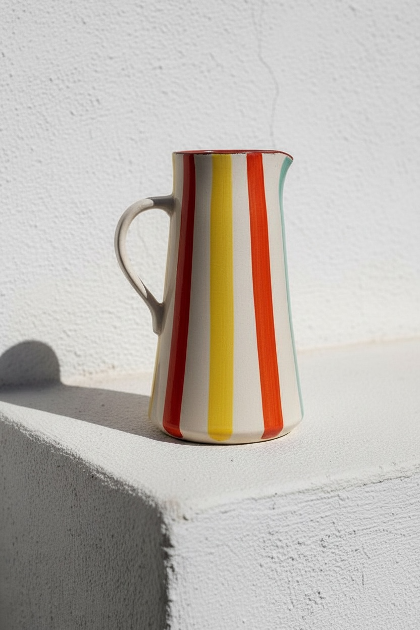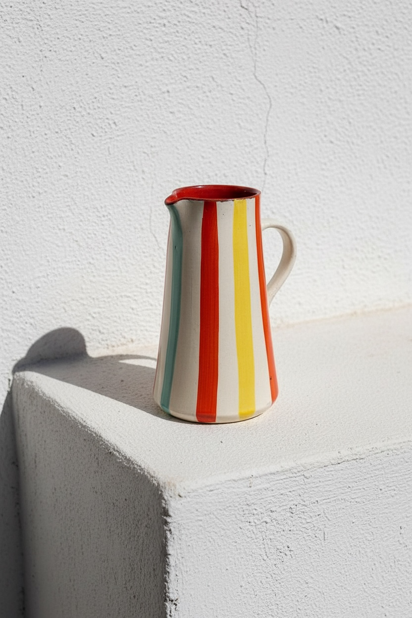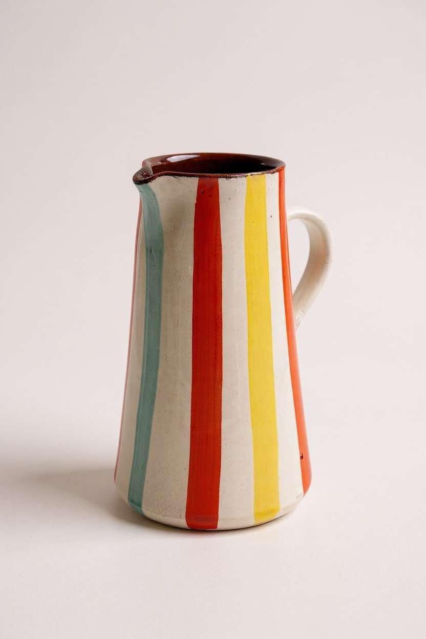 Jarra funcional y decorativa realizada a mano en barro rojo, modelada en el torno y pintada a mano. Cada pieza presenta variaciones propias del proceso manual, lo que la convierte en un objeto único.