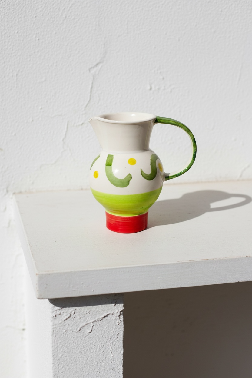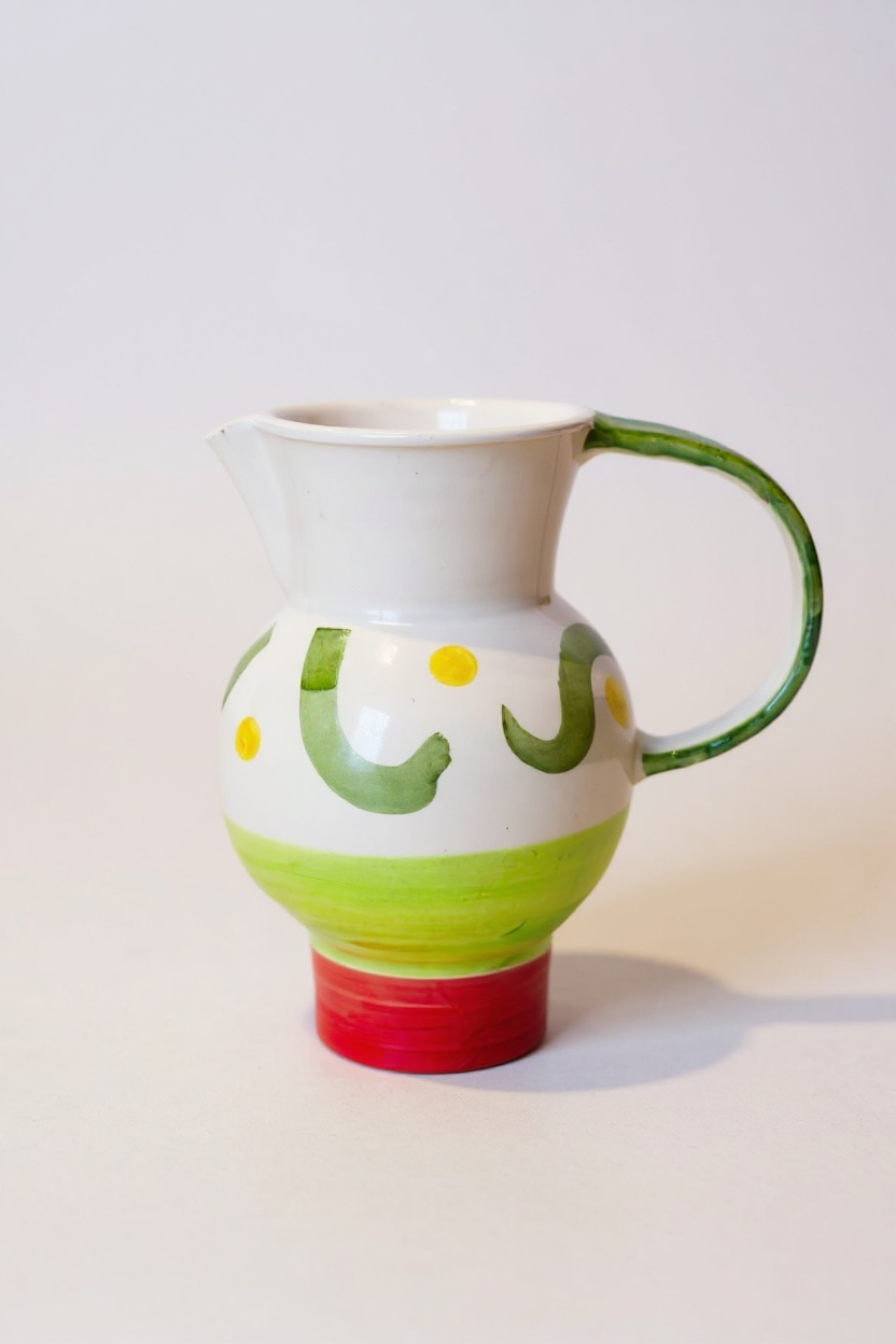 Jarra funcional y decorativa realizada a mano en barro rojo, modelada en el torno y pintada a mano. Cada pieza presenta variaciones propias del proceso manual, lo que la convierte en un objeto único.