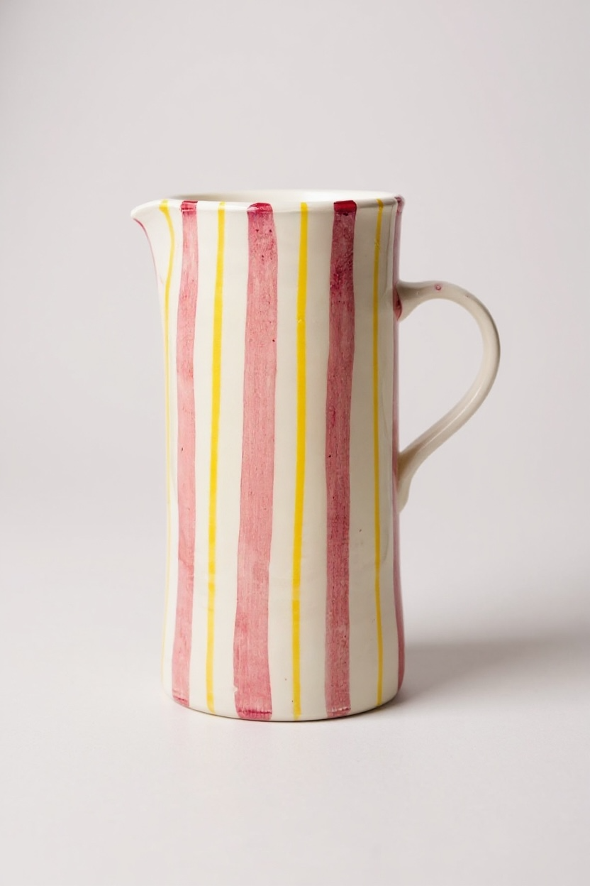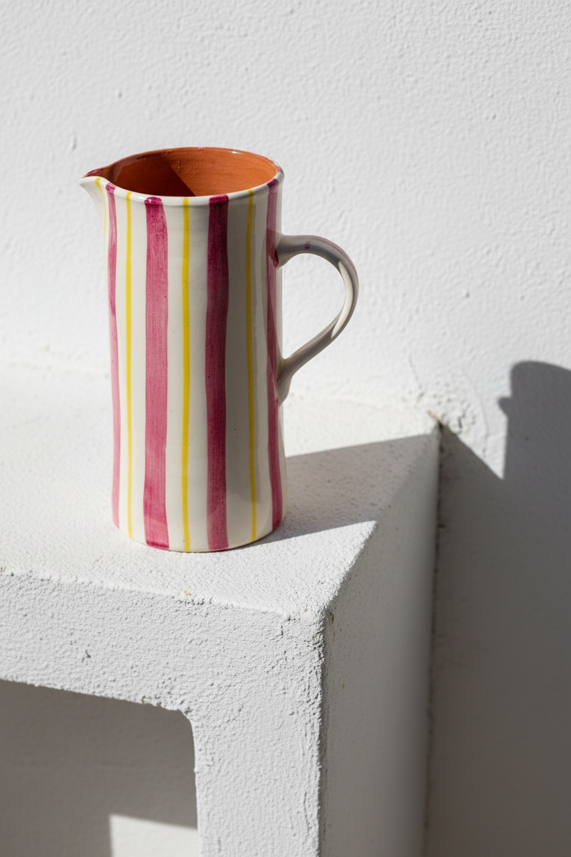 Jarra funcional y decorativa realizada a mano en barro rojo, modelada en el torno y pintada a mano. Cada pieza presenta variaciones propias del proceso manual, lo que la convierte en un objeto único.