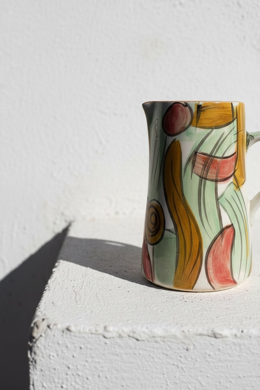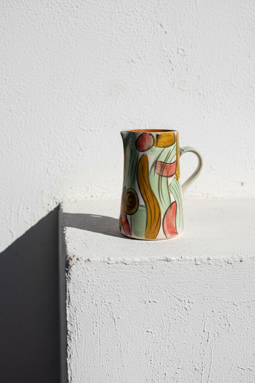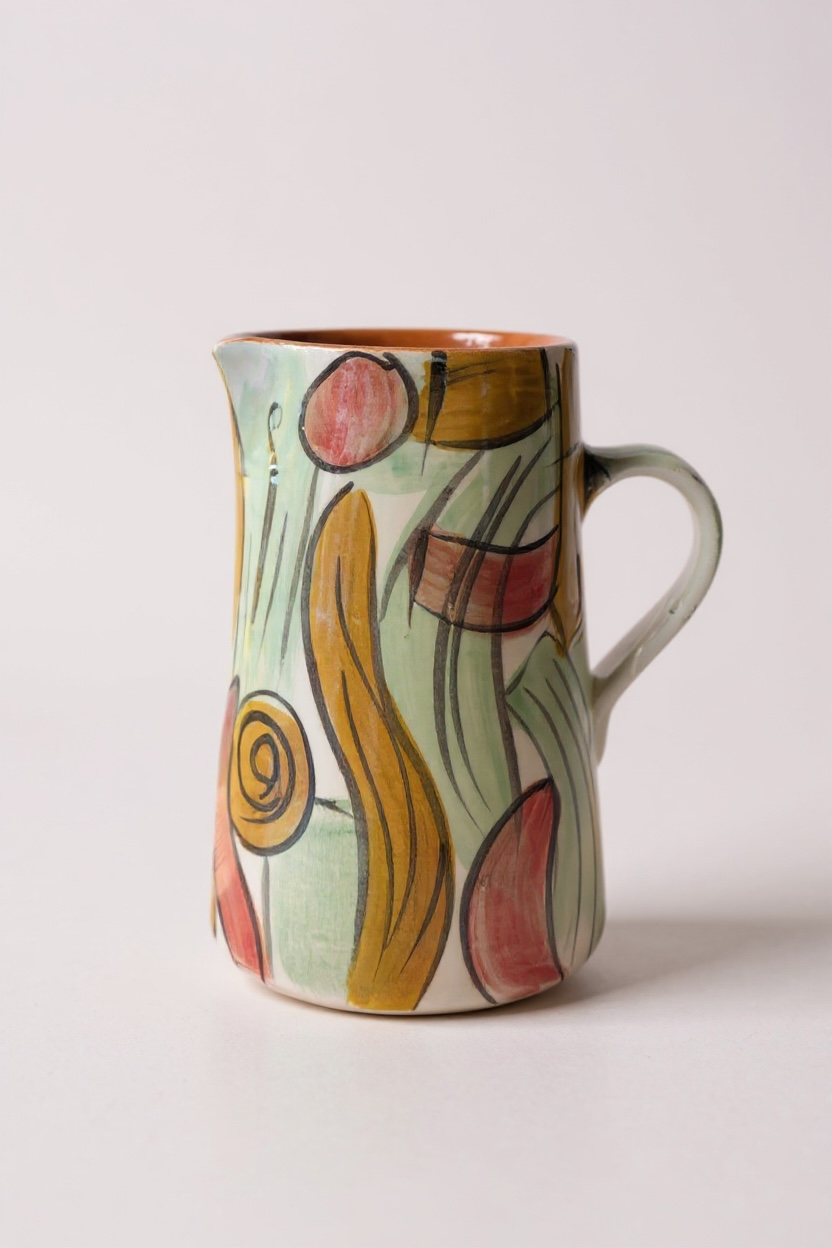 Jarra funcional y decorativa realizada a mano en barro rojo, modelada en el torno y pintada a mano. Cada pieza presenta variaciones propias del proceso manual, lo que la convierte en un objeto único.