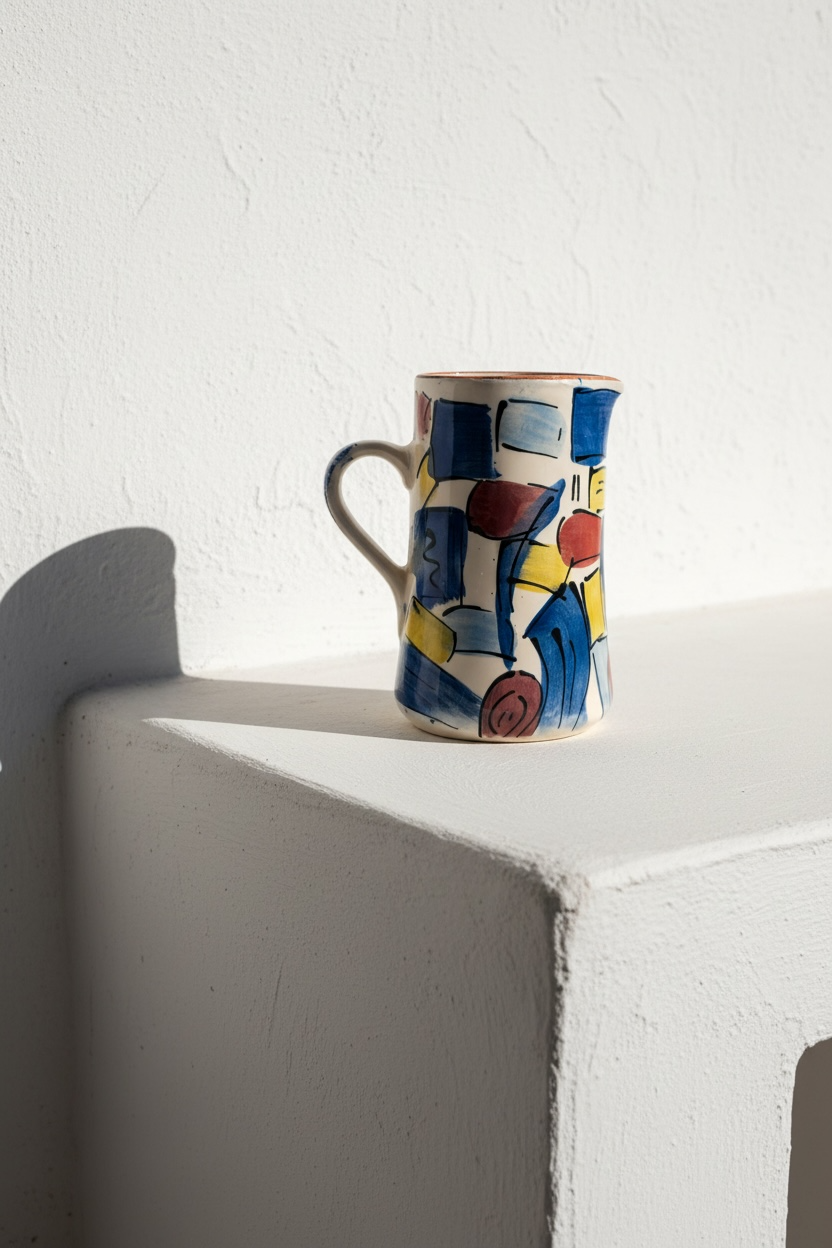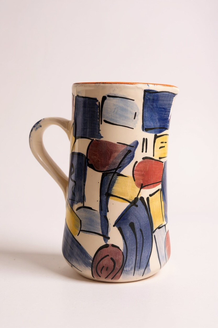 Jarra funcional y decorativa realizada a mano en barro rojo, modelada en el torno y pintada a mano. Cada pieza presenta variaciones propias del proceso manual, lo que la convierte en un objeto único.