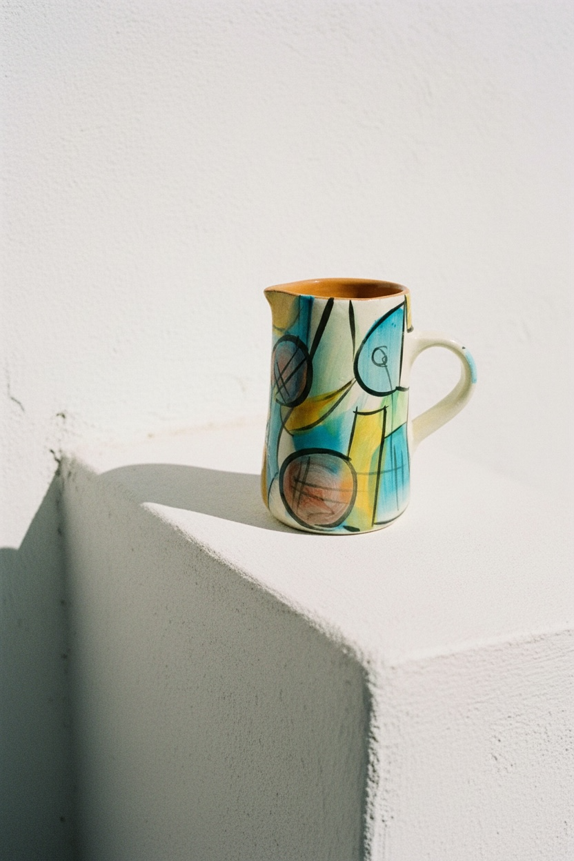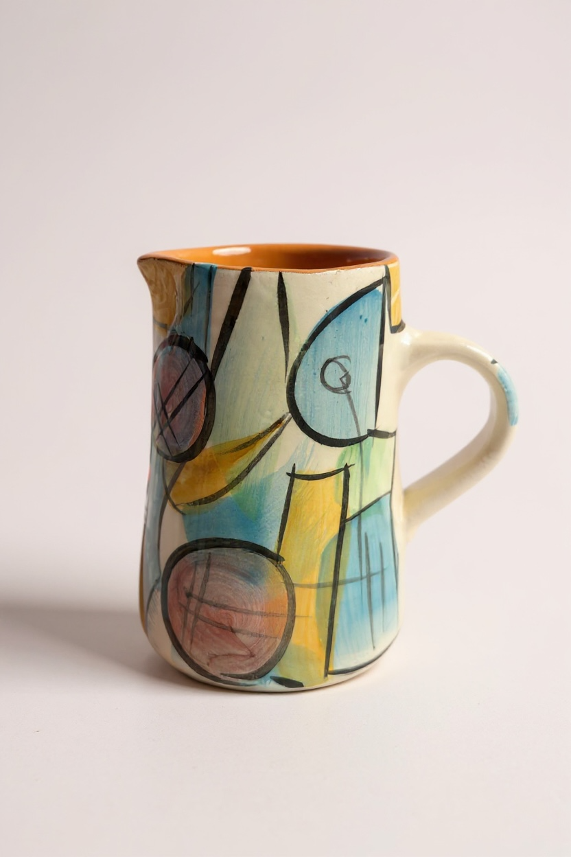 Jarra funcional y decorativa realizada a mano en barro rojo, modelada en el torno y pintada a mano. Cada pieza presenta variaciones propias del proceso manual, lo que la convierte en un objeto único.