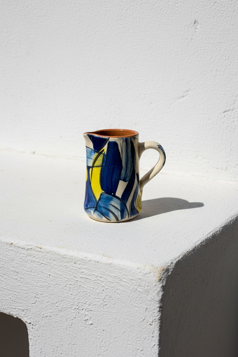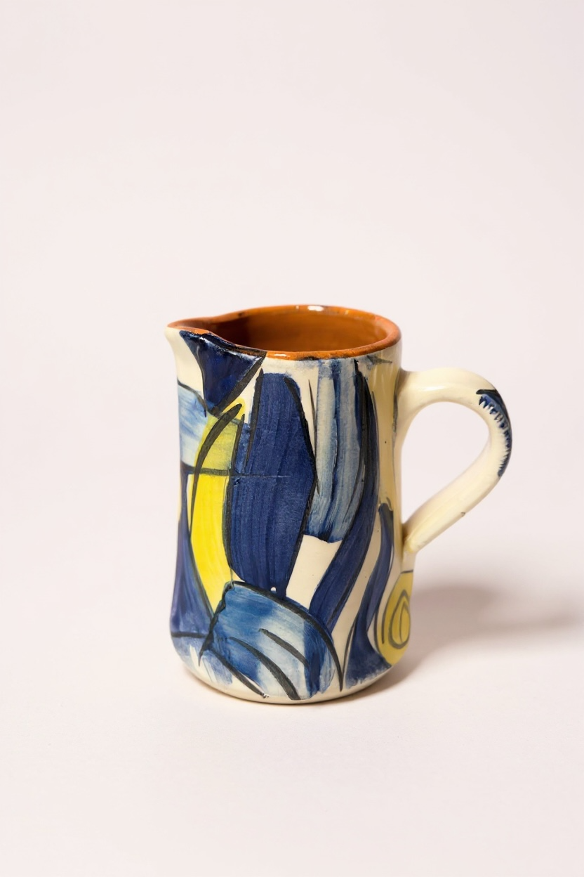Jarra funcional y decorativa realizada a mano en barro rojo, modelada en el torno y pintada a mano. Cada pieza presenta variaciones propias del proceso manual, lo que la convierte en un objeto único.