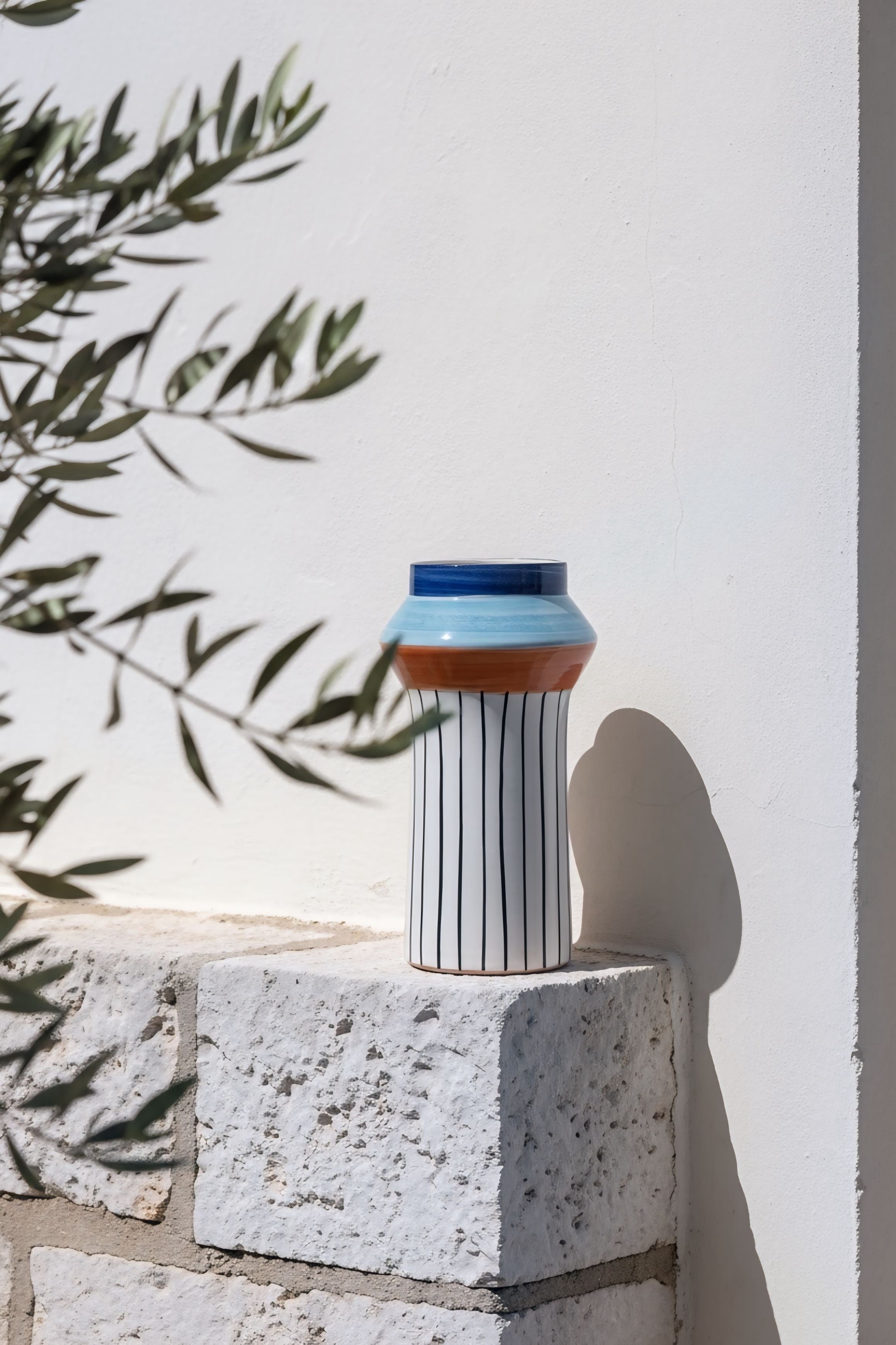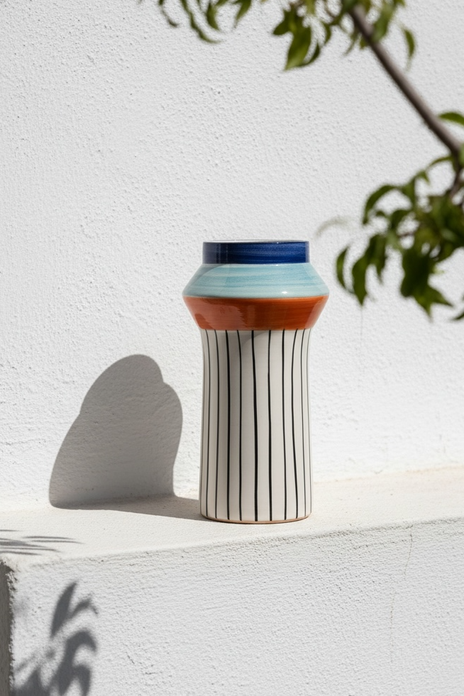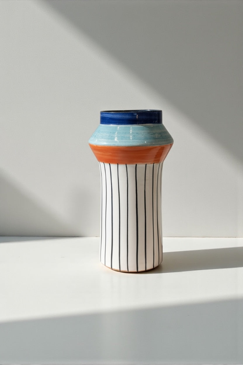 Cerámica torneada en barro rojo y esmaltada en un blanco suave, con líneas verticales finas aplicadas a pincel en un trazo continuo y preciso. La parte superior introduce un juego cromático en azul profundo, azul claro y un acento naranja cálido, creando un contraste arquitectónico. Su silueta alta y facetada refuerza la verticalidad del diseño.
