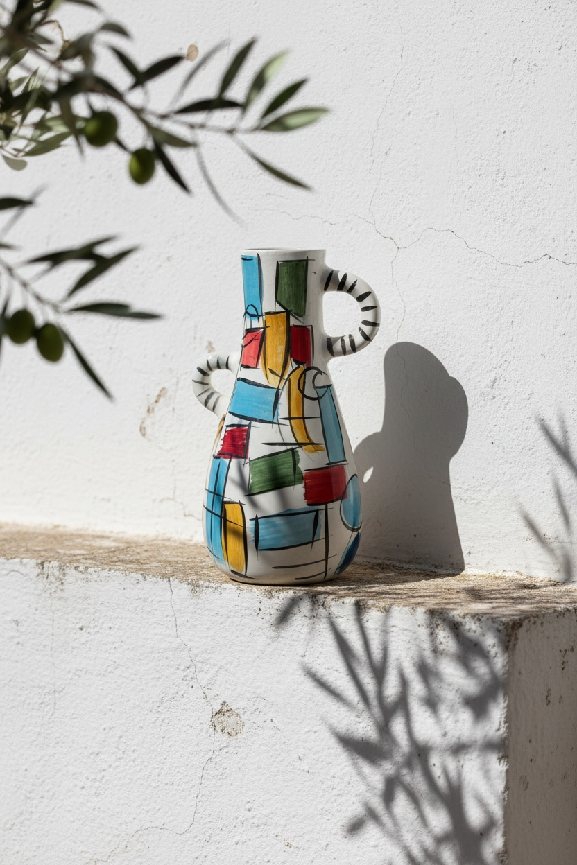 Pieza escultórica en barro rojo, esmaltada en blanco y decorada a mano con formas geométricas en azul, verde, ocre y rojo. Las asas dobles en espiral refuerzan su equilibrio visual y acentúan la verticalidad del conjunto. Cada jarrón se modela y pinta individualmente en el taller, conservando las variaciones propias de la cerámica artesanal.