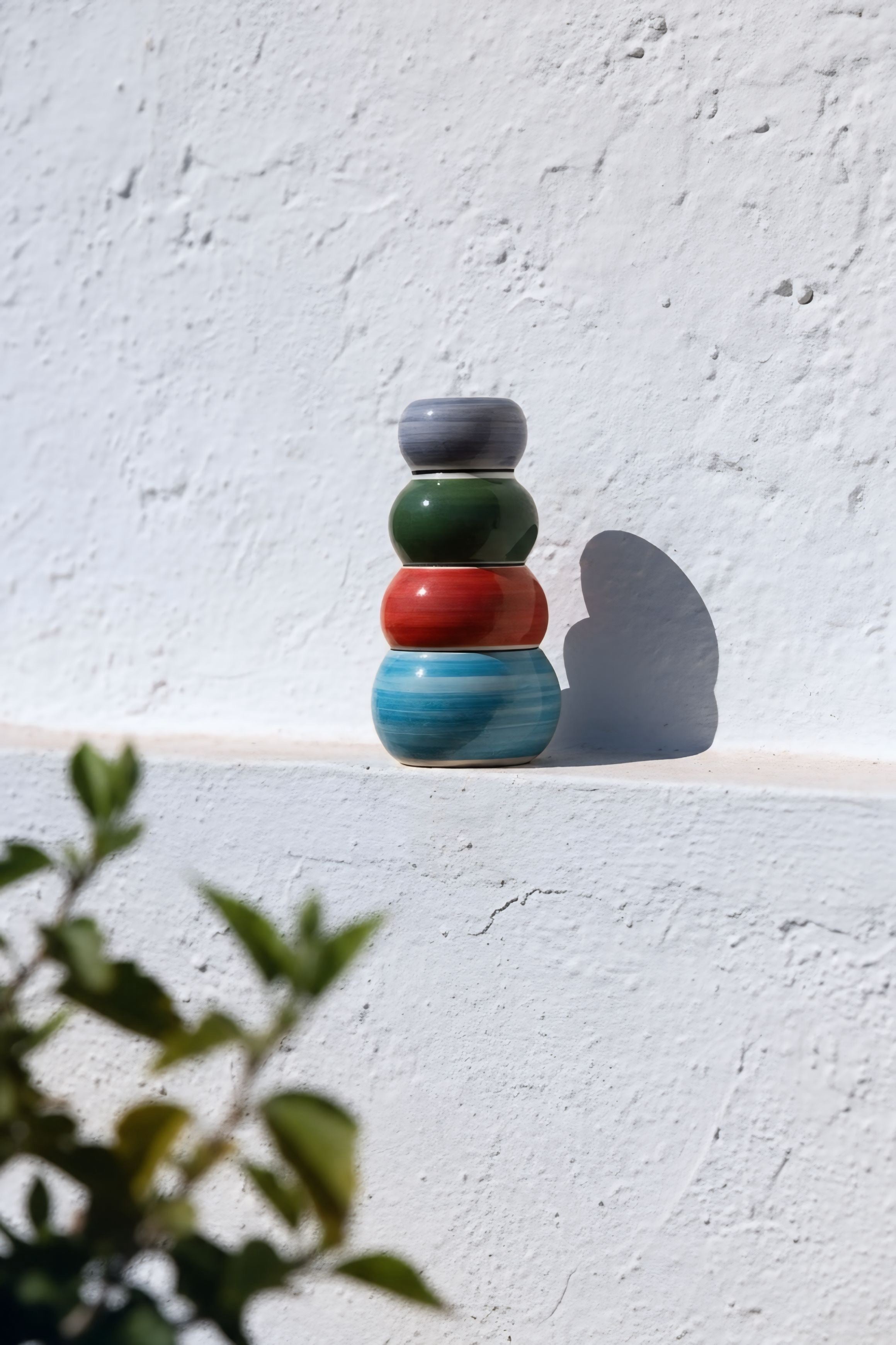 Pieza escultórica en barro rojo, esmaltada en blanco y decorada a mano con franjas de color en azul, rojo, verde y violeta. Los volúmenes superpuestos generan un perfil orgánico y vertical con lectura escultórica. Cada jarrón se modela y pinta individualmente en el taller de Madrid, conservando las variaciones propias de la cerámica artesanal.