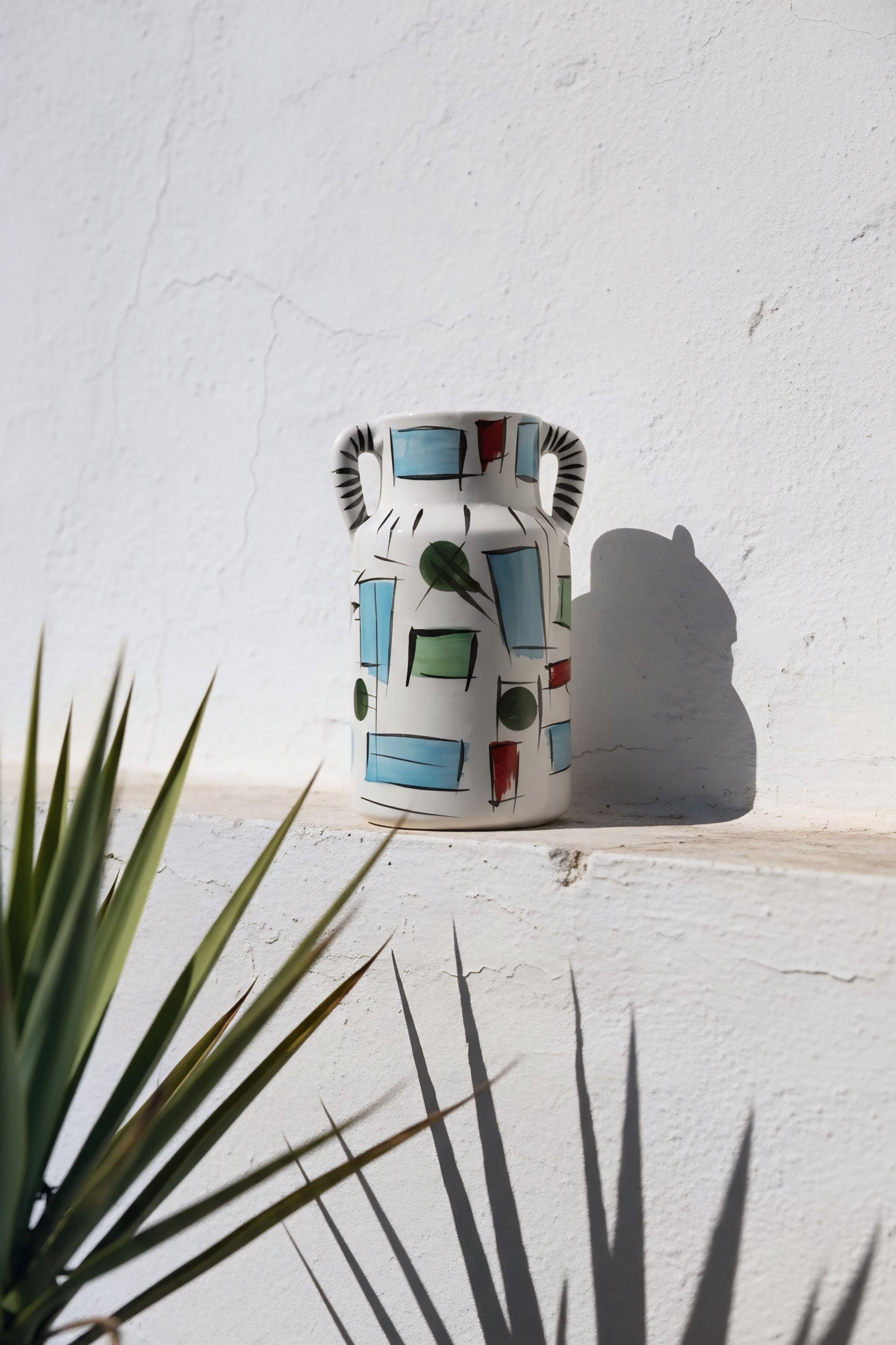 Pieza escultórica en barro rojo, esmaltada en blanco y decorada a mano con composiciones geométricas en azul, verde y rojo. Las asas con líneas negras aportan equilibrio visual y definen su carácter contemporáneo. Cada jarrón se modela y pinta individualmente en el taller, conservando las variaciones propias de la cerámica artesanal.