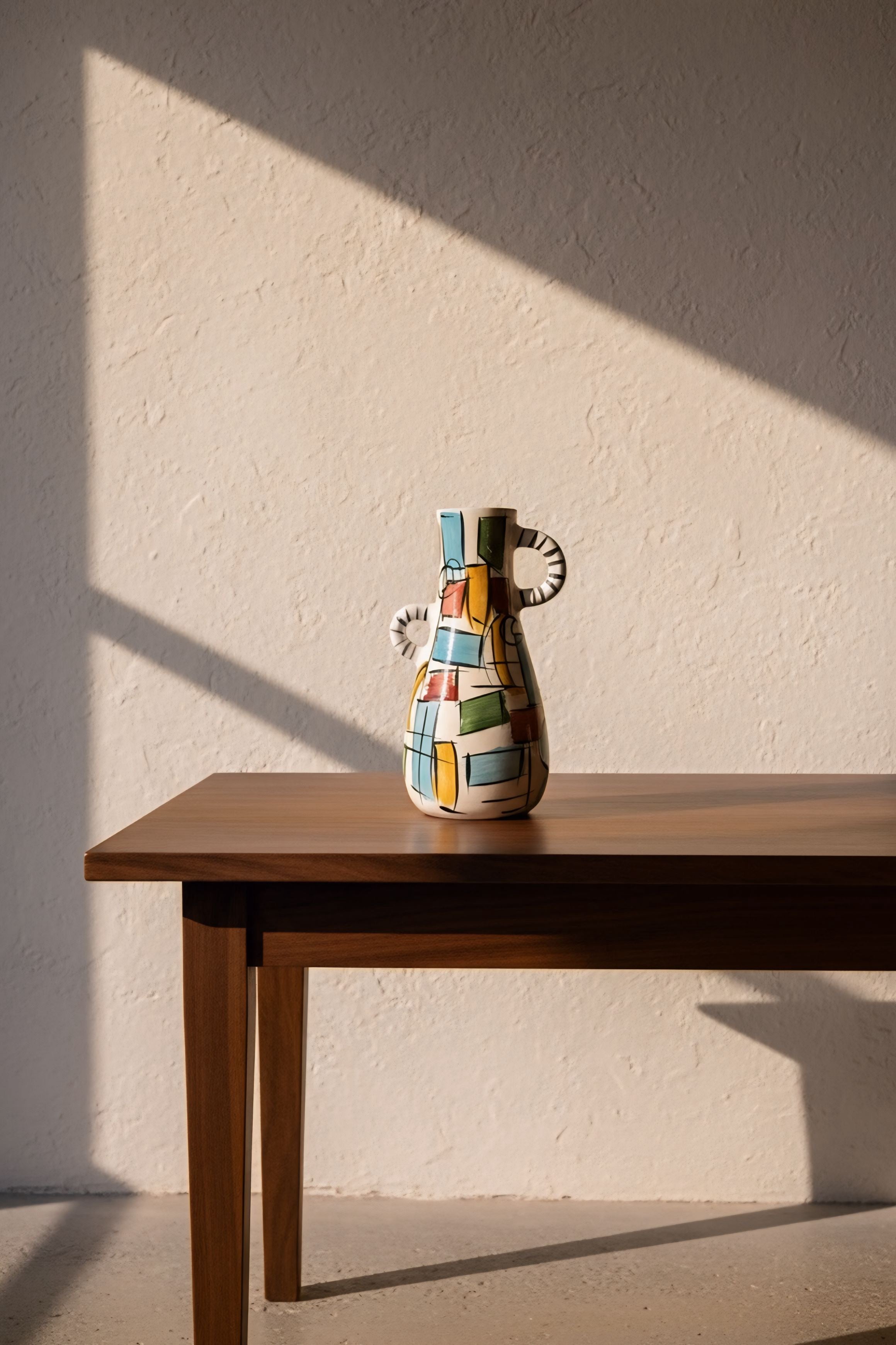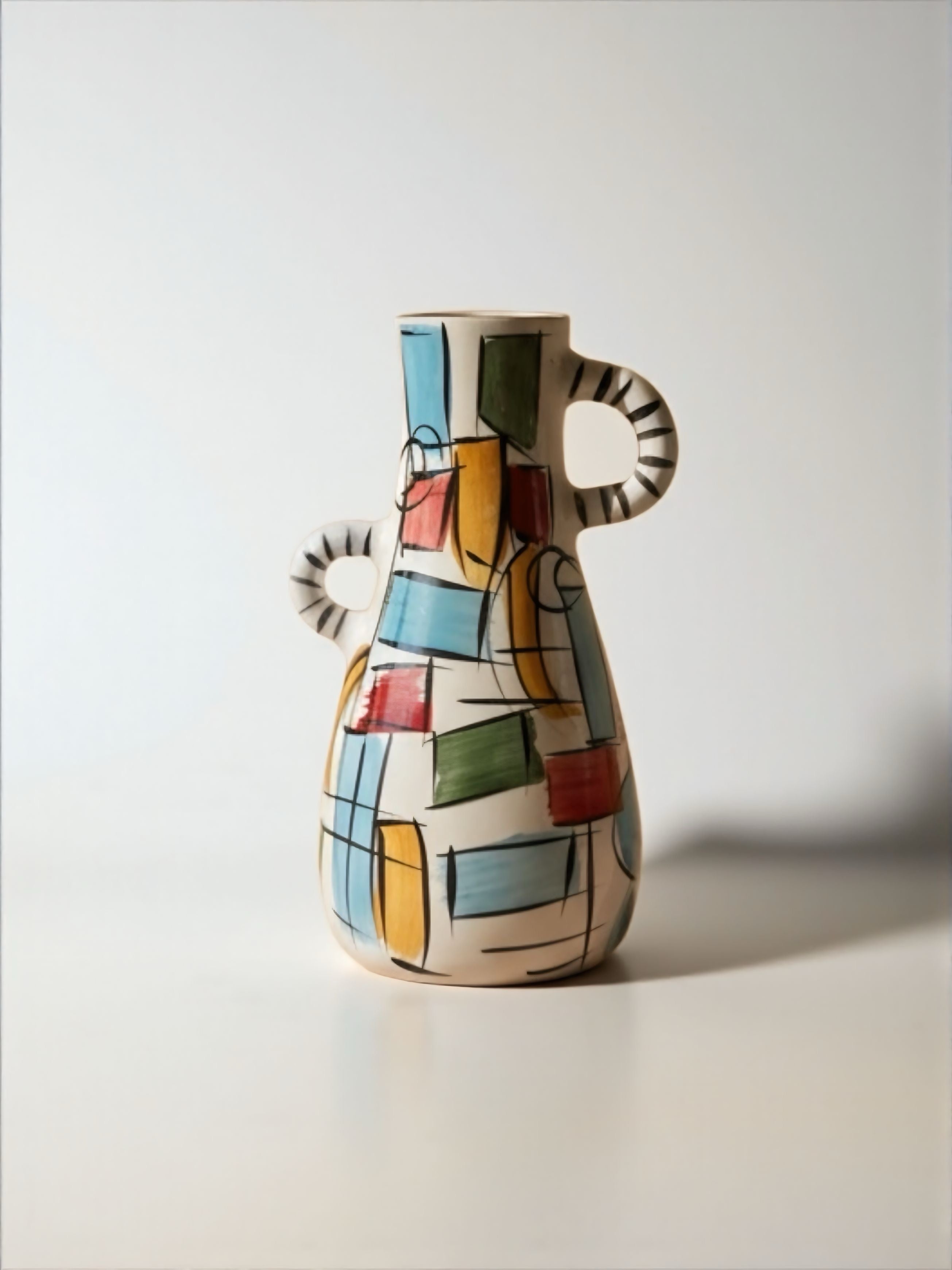 Pieza escultórica en barro rojo, esmaltada en blanco y decorada a mano con formas geométricas en azul, verde, ocre y rojo. Las asas dobles en espiral refuerzan su equilibrio visual y acentúan la verticalidad del conjunto. Cada jarrón se modela y pinta individualmente en el taller, conservando las variaciones propias de la cerámica artesanal.