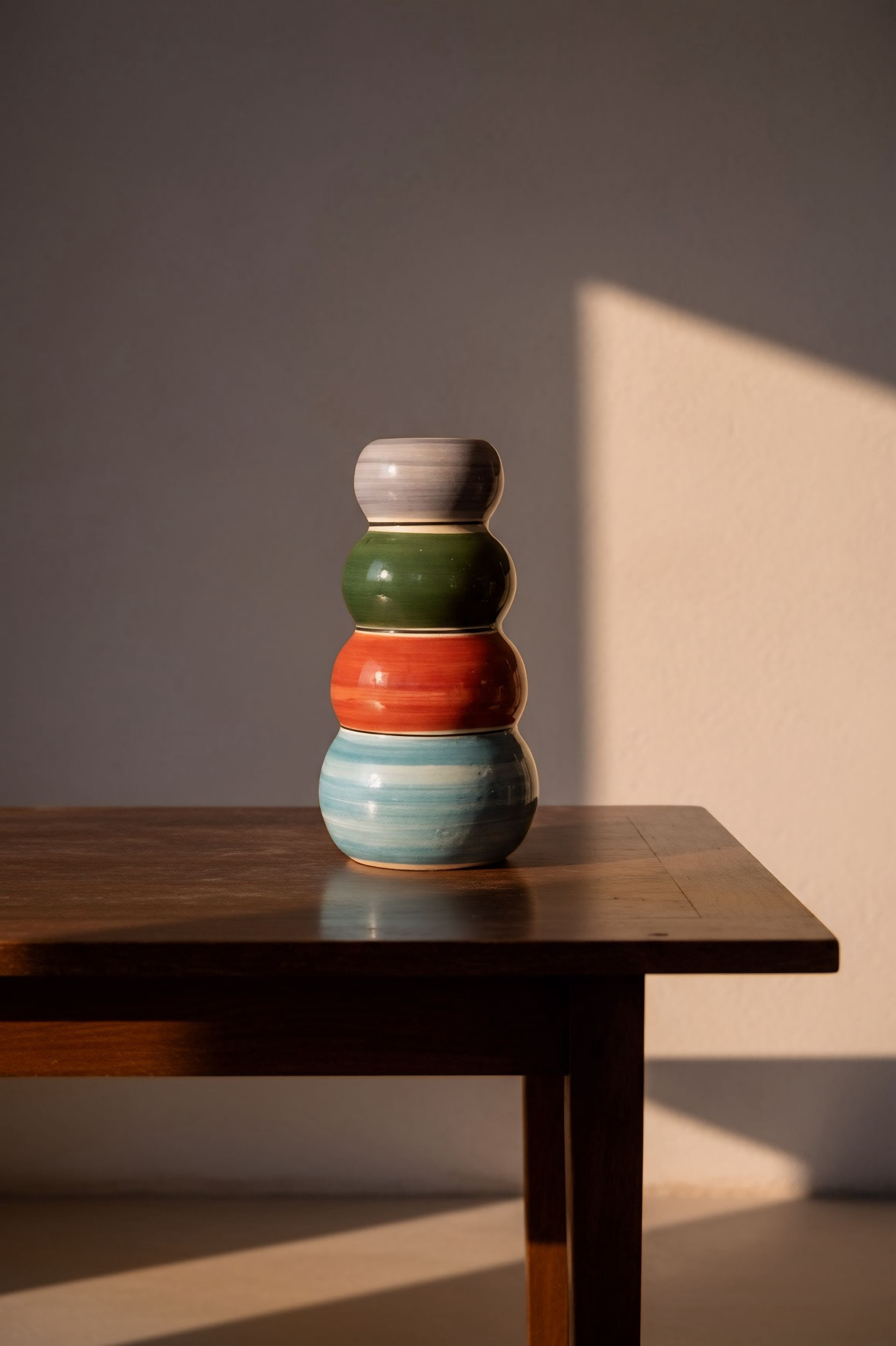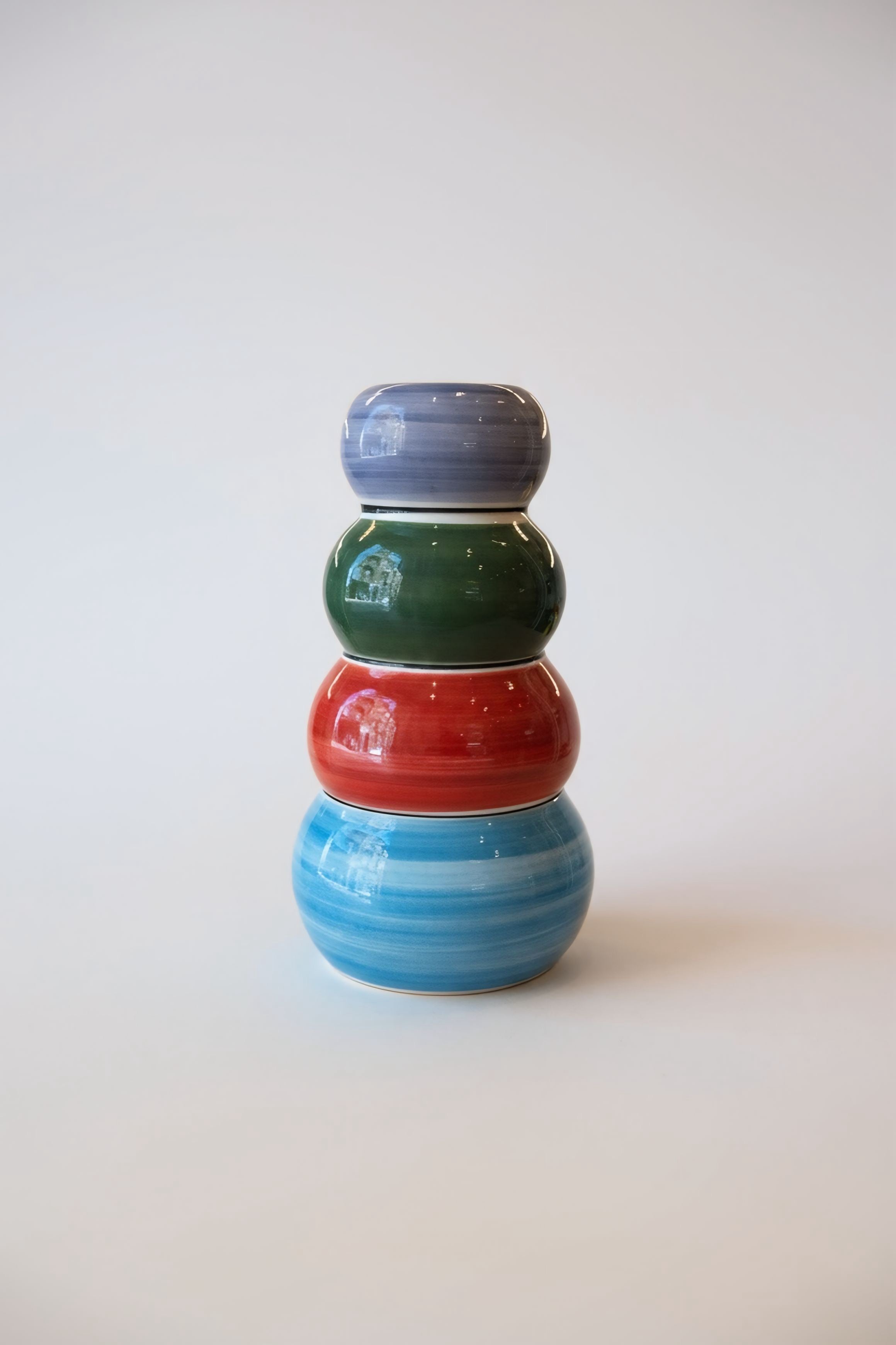 Pieza escultórica en barro rojo, esmaltada en blanco y decorada a mano con franjas de color en azul, rojo, verde y violeta. Los volúmenes superpuestos generan un perfil orgánico y vertical con lectura escultórica. Cada jarrón se modela y pinta individualmente en el taller de Madrid, conservando las variaciones propias de la cerámica artesanal.