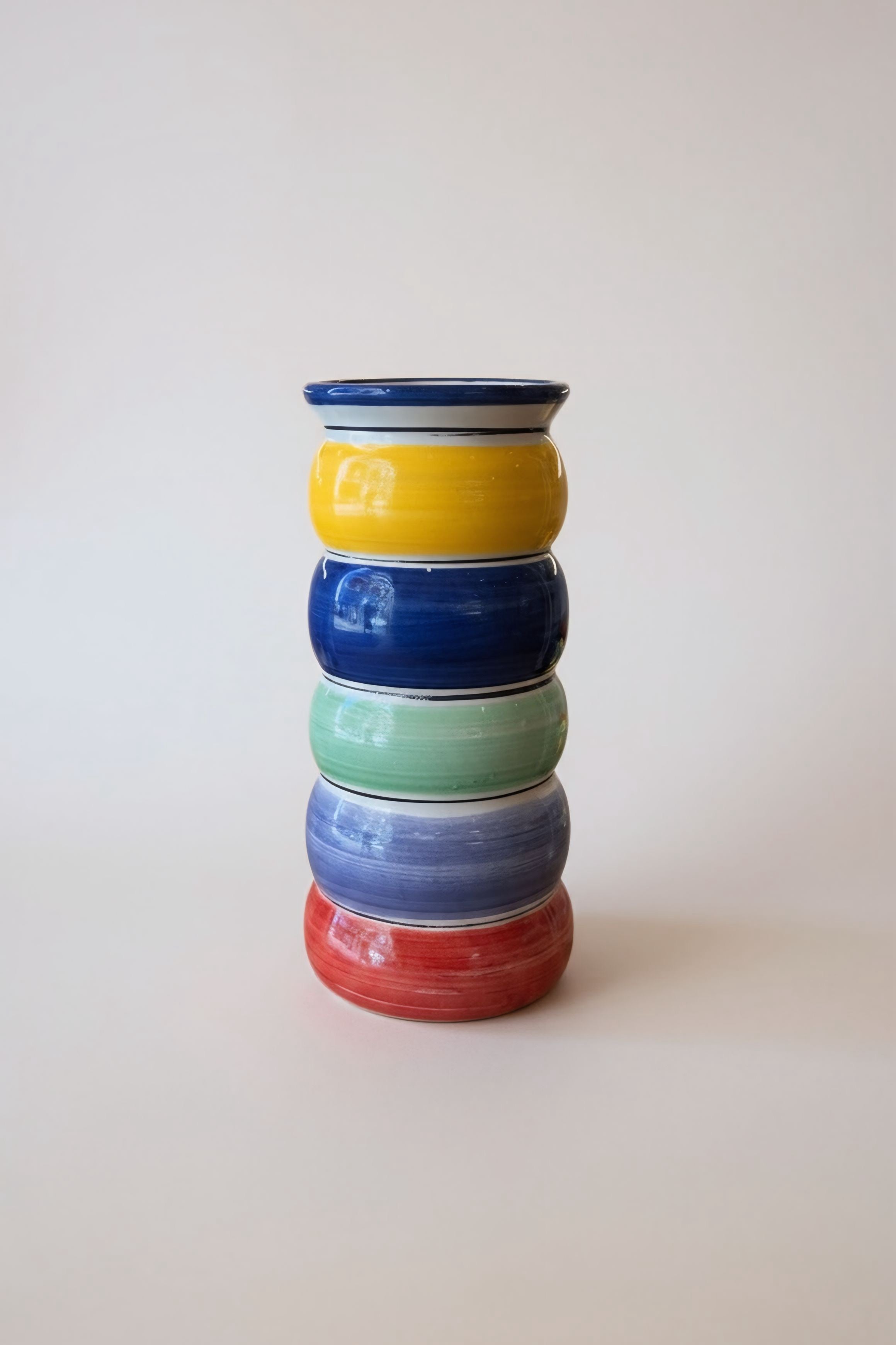 Pieza escultórica en barro rojo, esmaltada en blanco y decorada a mano con franjas de color en amarillo, azul, verde, violeta y rojo. Los cuerpos curvos superpuestos generan un perfil orgánico y vertical con lectura escultórica. Cada jarrón se modela y pinta individualmente en el taller de Madrid, conservando las variaciones propias de la cerámica artesanal.