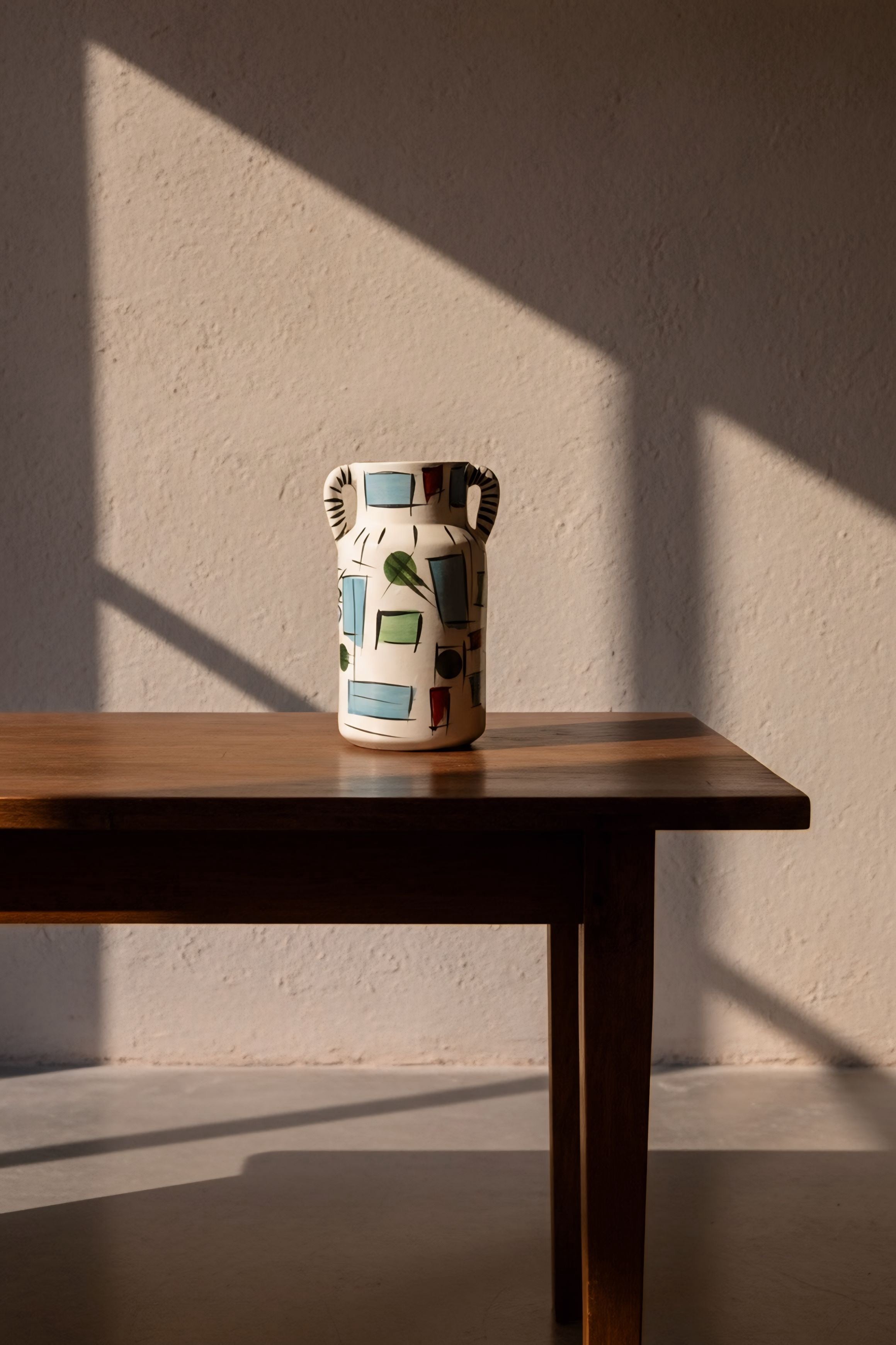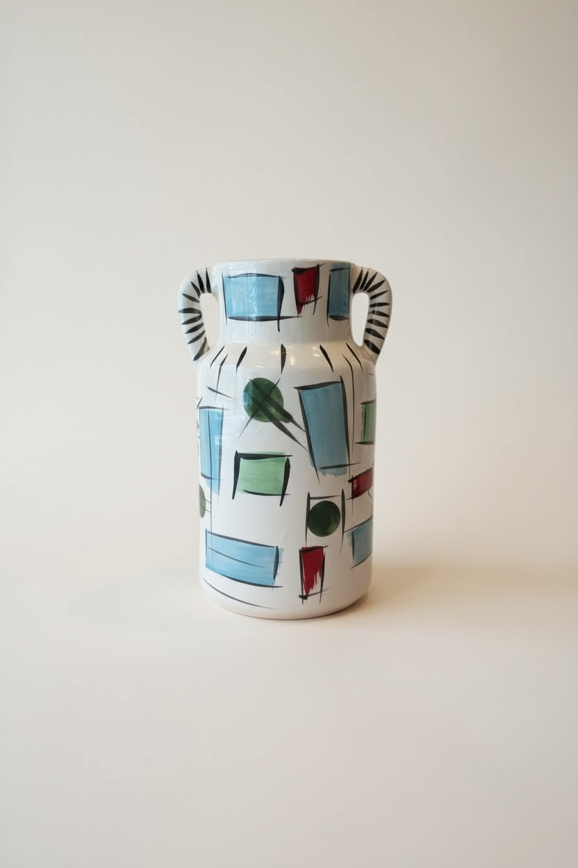 Pieza escultórica en barro rojo, esmaltada en blanco y decorada a mano con composiciones geométricas en azul, verde y rojo. Las asas con líneas negras aportan equilibrio visual y definen su carácter contemporáneo. Cada jarrón se modela y pinta individualmente en el taller, conservando las variaciones propias de la cerámica artesanal.