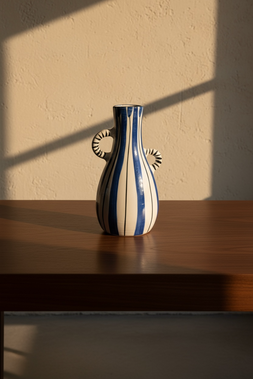Pieza escultórica en barro rojo, esmaltada en blanco y decorada a mano con líneas verticales en azul y negro. Las asas gemelas anilladas equilibran la verticalidad del cuerpo y acentúan su lectura escultórica. Cada jarrón se modela y pinta individualmente en el taller de Madrid, conservando las variaciones propias de la cerámica artesanal.