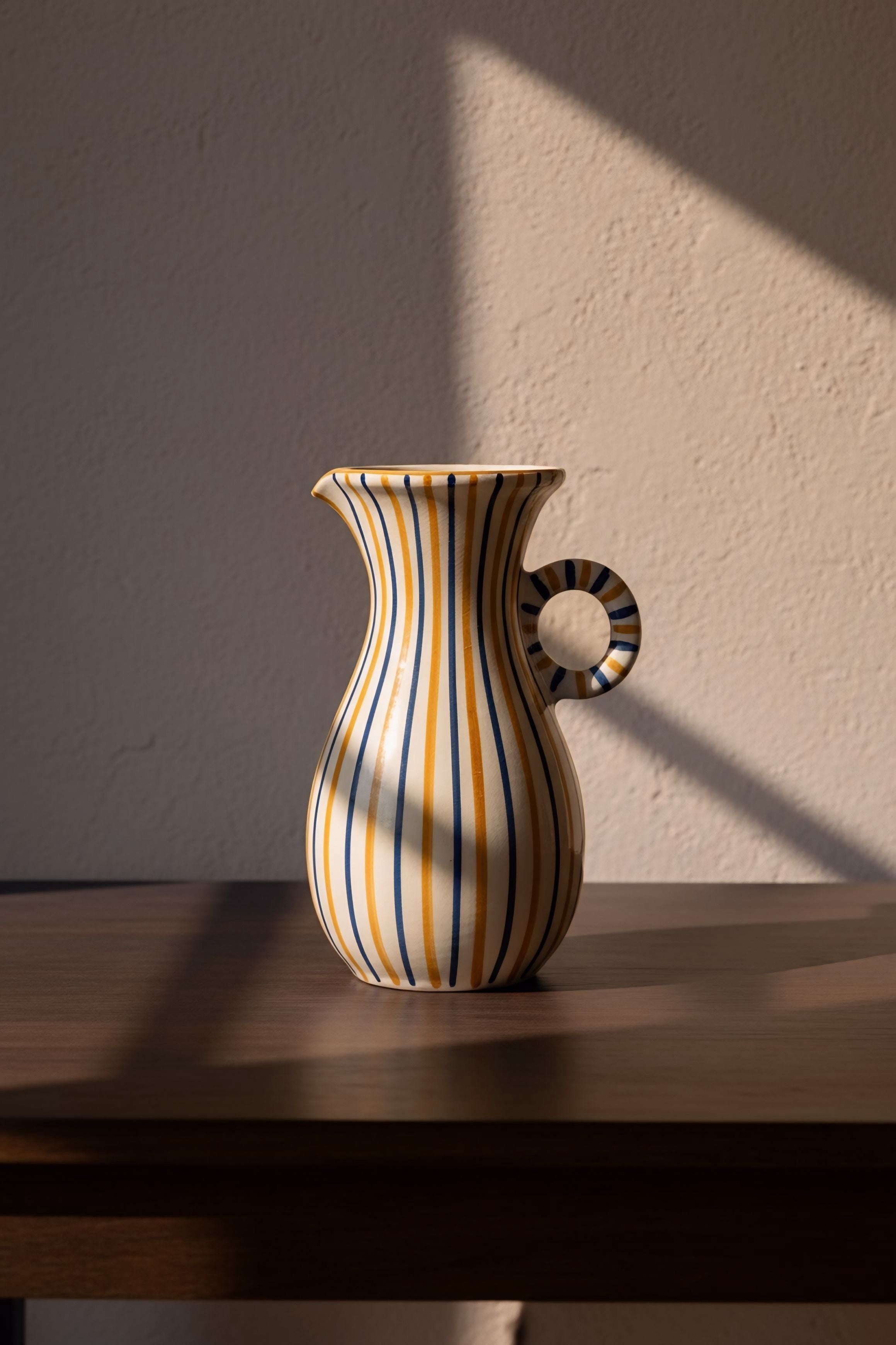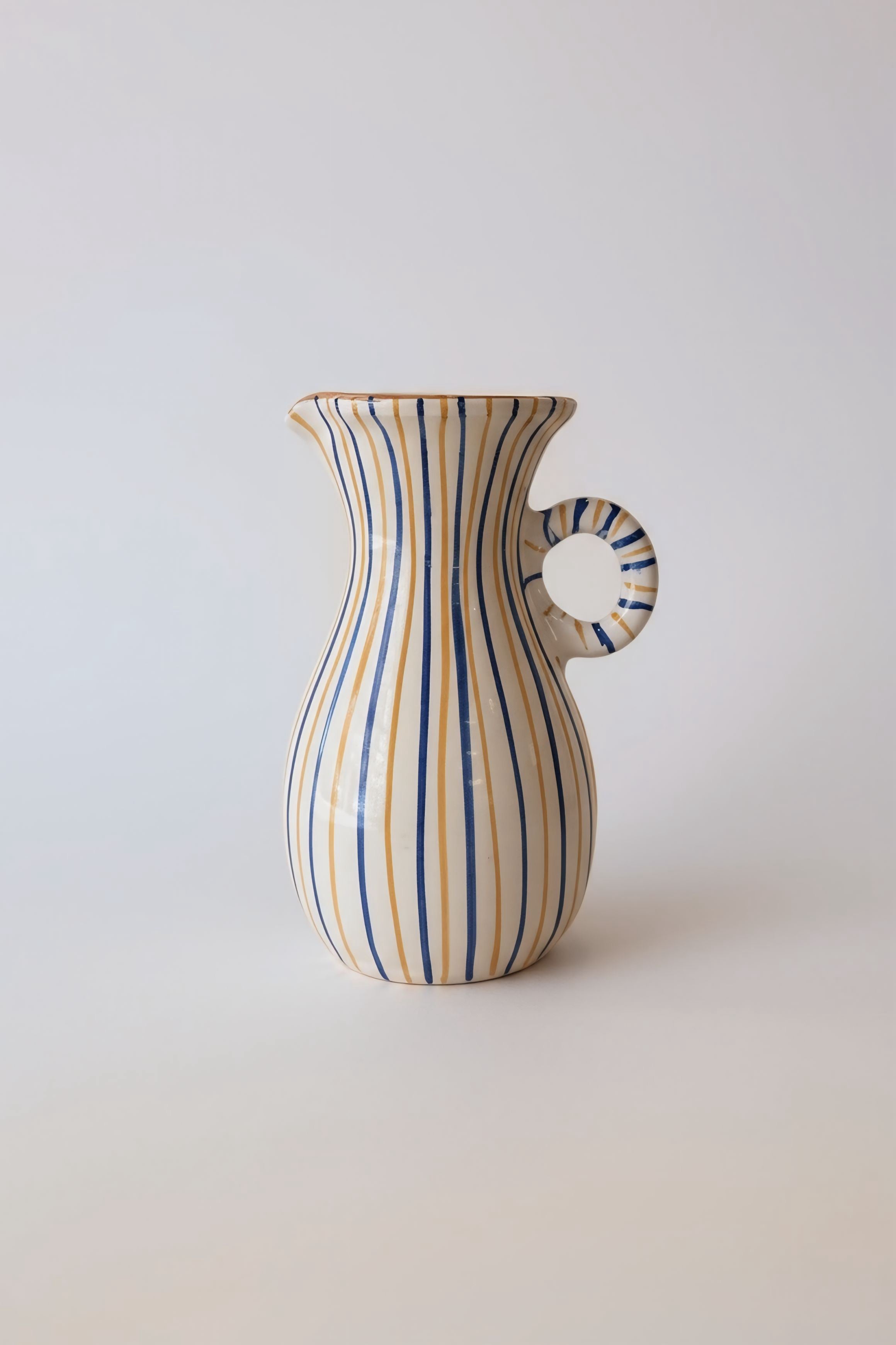 Pieza escultórica en barro rojo, esmaltada en blanco y decorada a mano con líneas verticales en azul y ocre. La silueta curva y el asa anillada refuerzan el carácter gráfico de la pieza. Cada jarrón se modela y pinta individualmente en el taller de Madrid, conservando las variaciones propias de la cerámica artesanal.