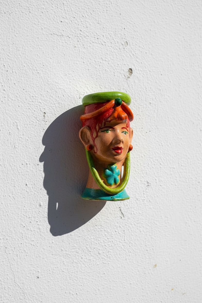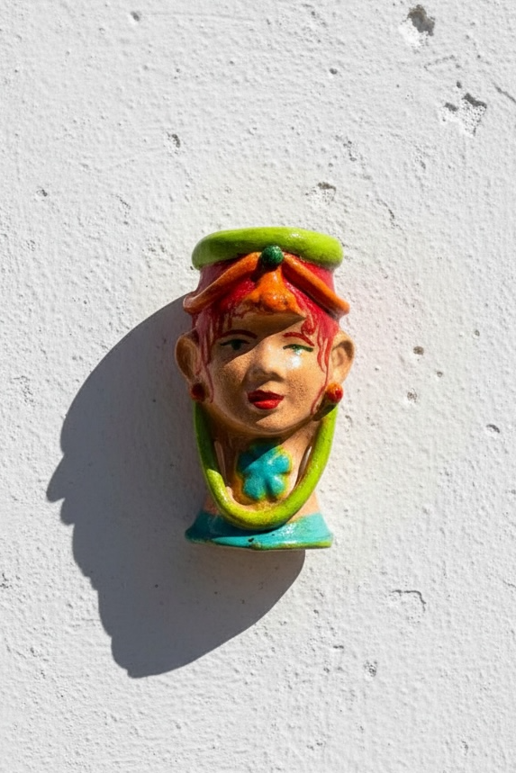 Pieza mural en cerámica esmaltada, con cabello rojo recogido bajo un tocado verde. Inspirada en los rostros andaluces y los colores del verano. Una pieza entre lo folclórico y lo fabuloso.