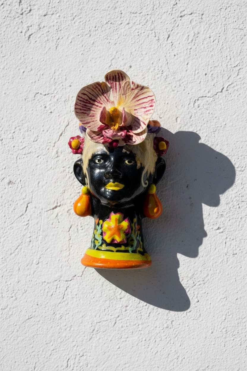 Pieza de cerámica esmaltada con rostro oscuro coronado por una orquídea blanca de pétalos reales. Un objeto único que mezcla flor, rostro y ornamento en clave tropical y luminosa.
