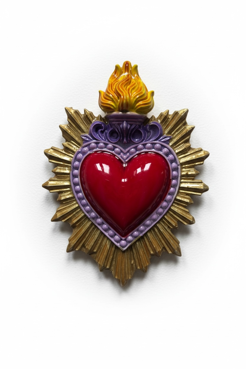 Exvoto corazón radiante · Relieve escultórico en cerámica esmaltada