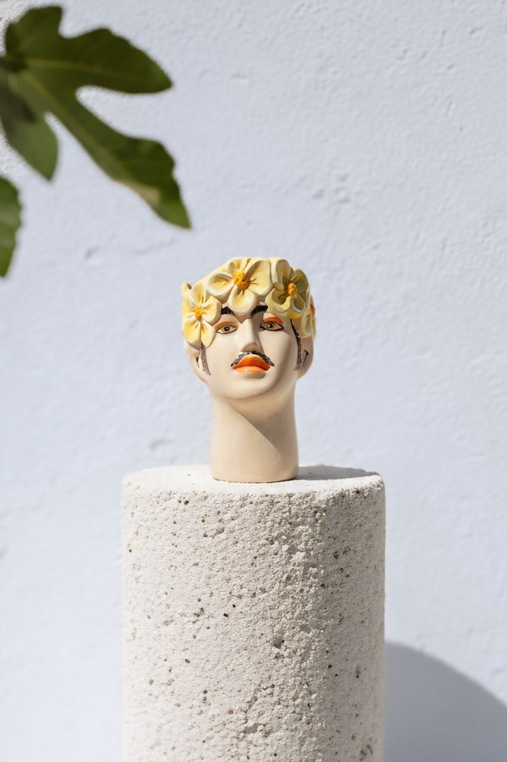 Florero con forma de cabeza de hombre con flores en la cabeza y pintado a mano.
