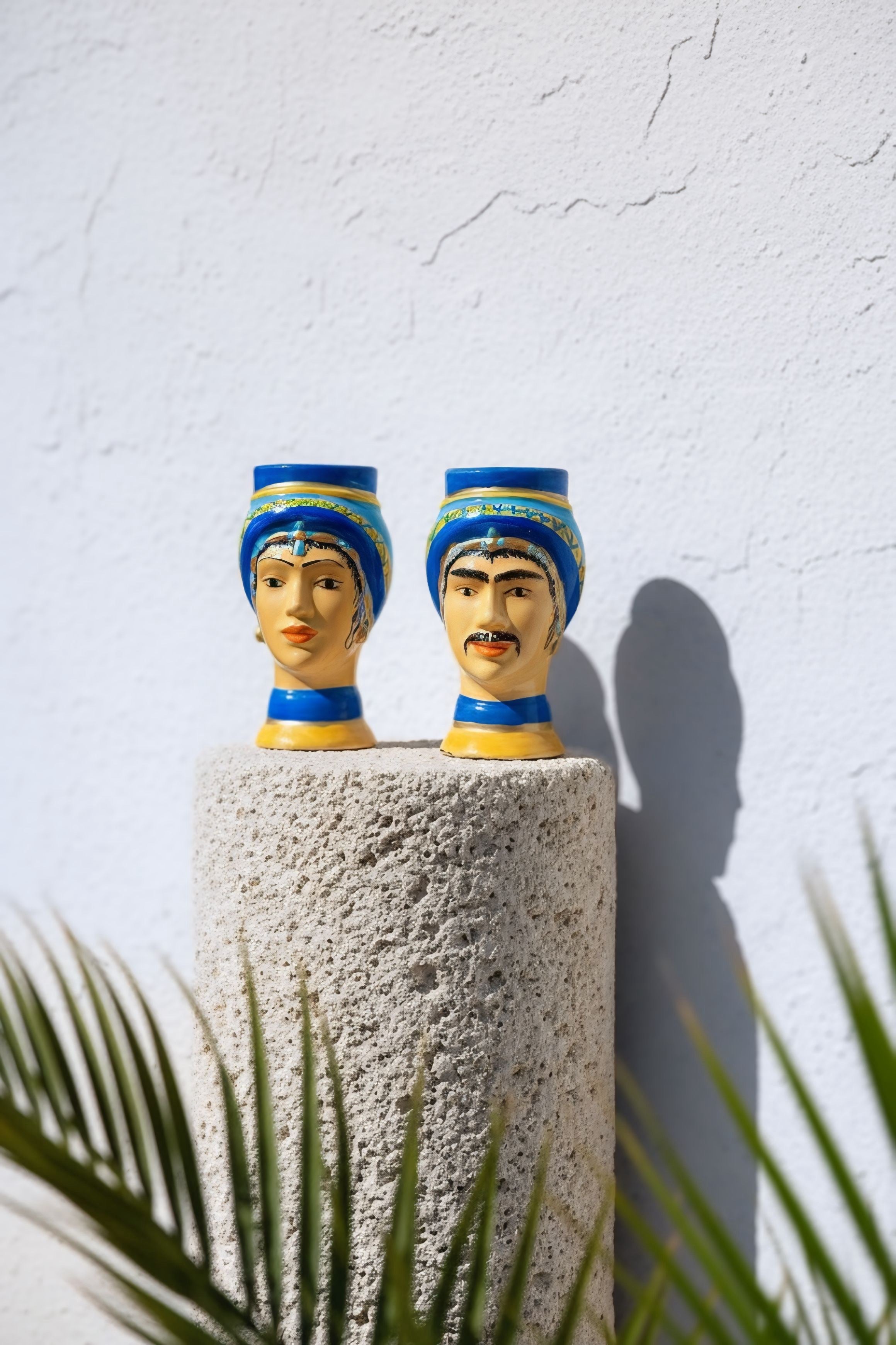 Pareja de bustos en cerámica pintada a mano, inspirados en las figuras tradicionales mediterráneas. Cada pieza presenta un turbante azul intenso con detalles geométricos y una base en ocre dorado, realzando los rasgos expresivos de los rostros. Ideales como piezas decorativas o para uso como jarrón de boca ancha.