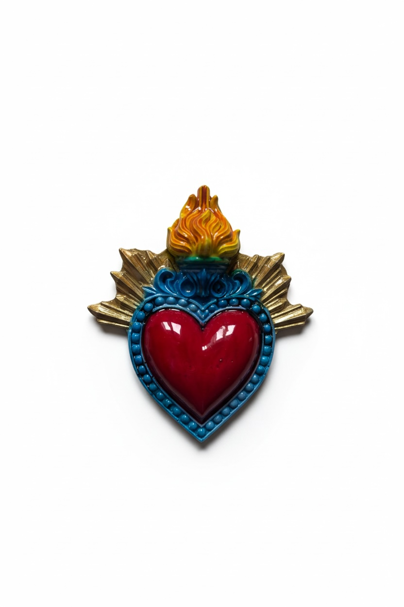 Exvoto con corazón central esmaltado en rojo intenso sobre marco radial en tono dorado.