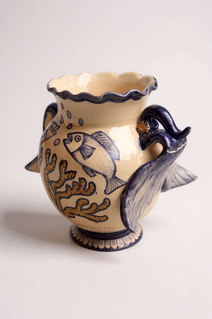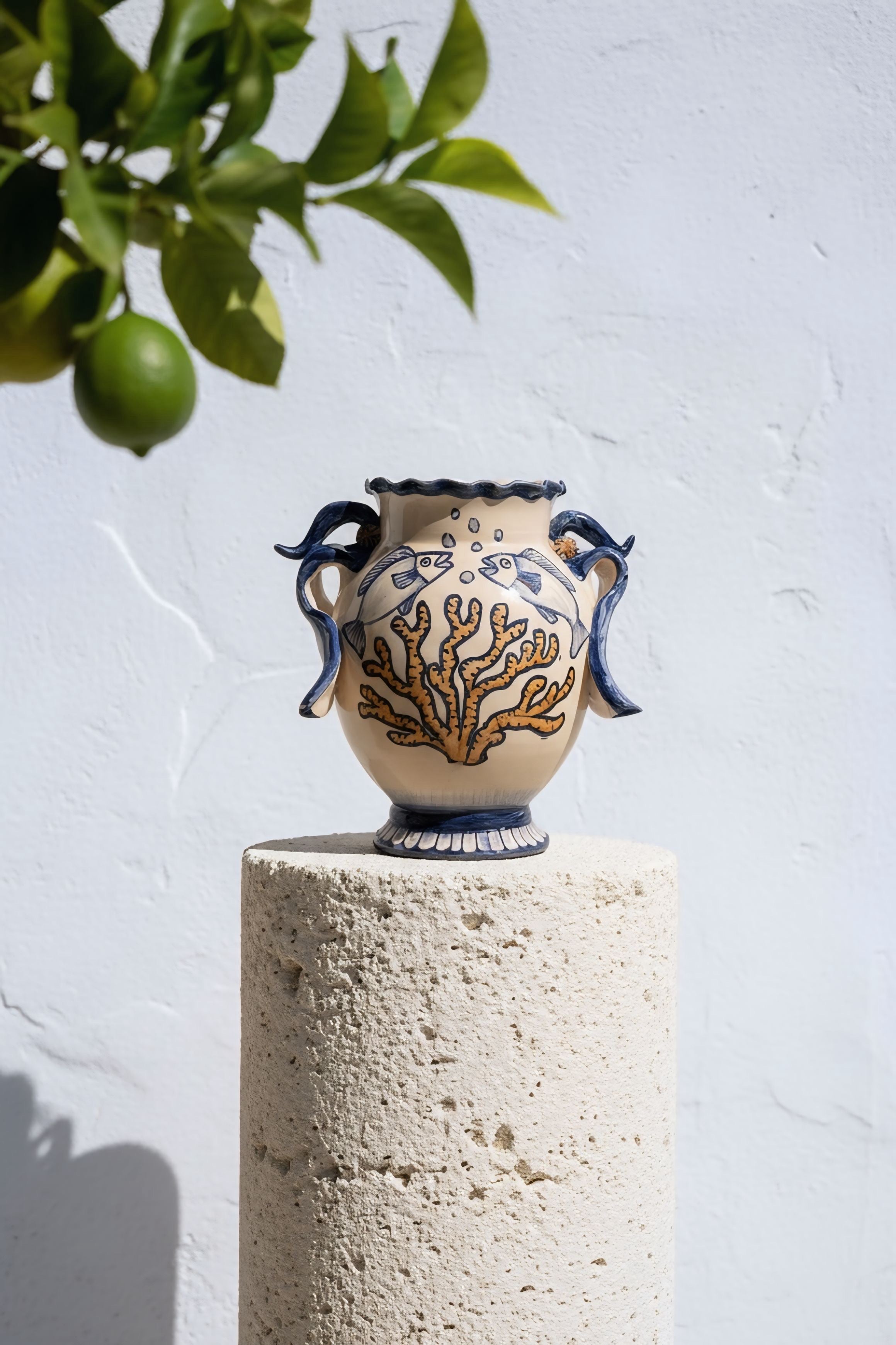 El Jarrón Nereida es una inmersión profunda en el imaginario marino de la colección. Diseñado y pintado a mano por Sete Morueco, destaca por sus asas escultóricas modeladas en forma de colas de pez que parecen impulsarse en el agua. El cuerpo de la pieza sirve de lienzo para un gran coral ramificado en tonos ocres, sobre el que nadan dos peces en azul cobalto, creando una escena submarina llena de movimiento y vida.