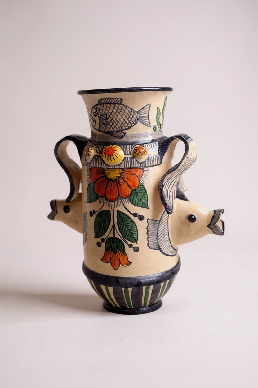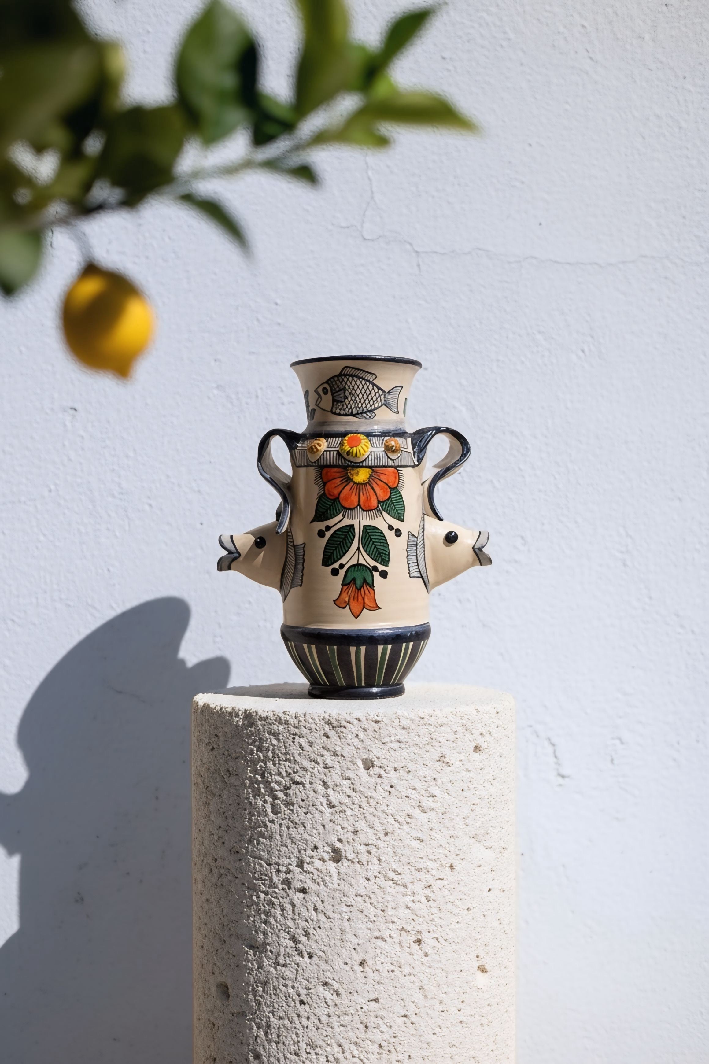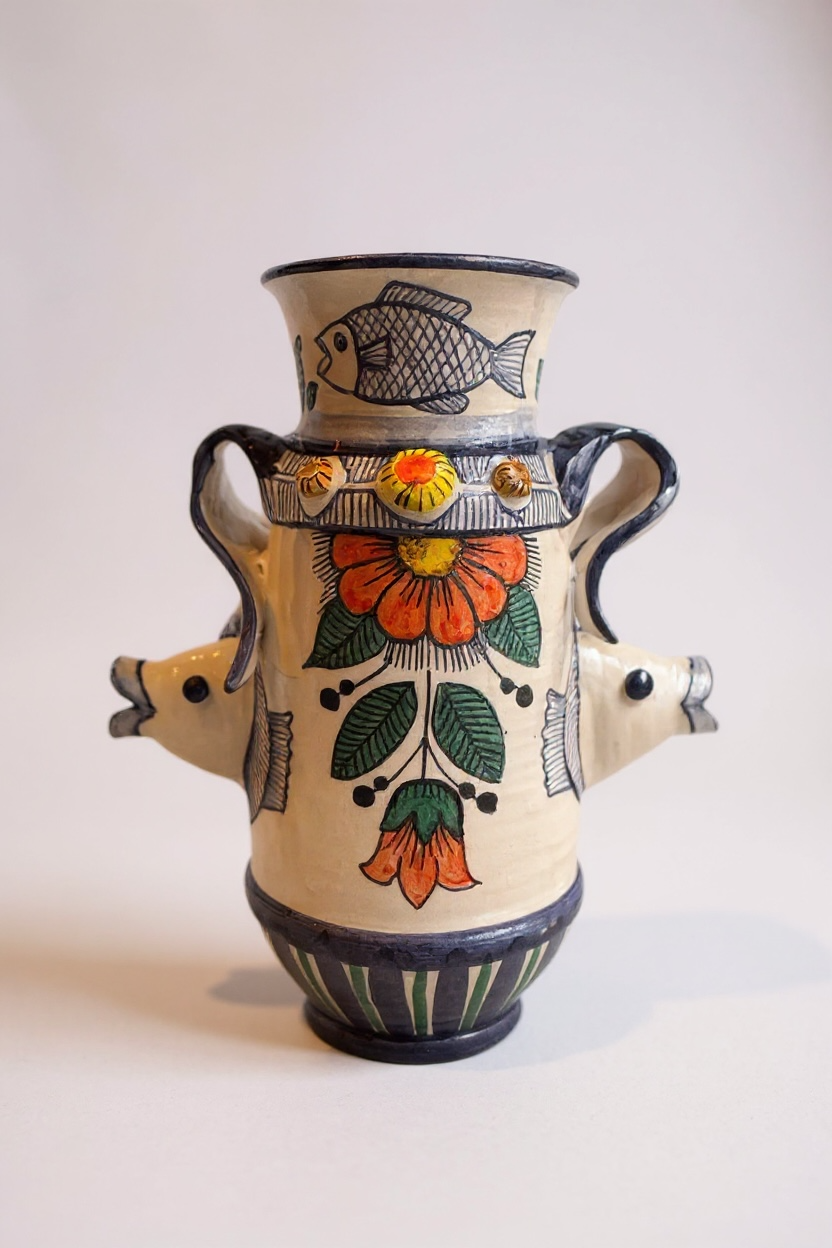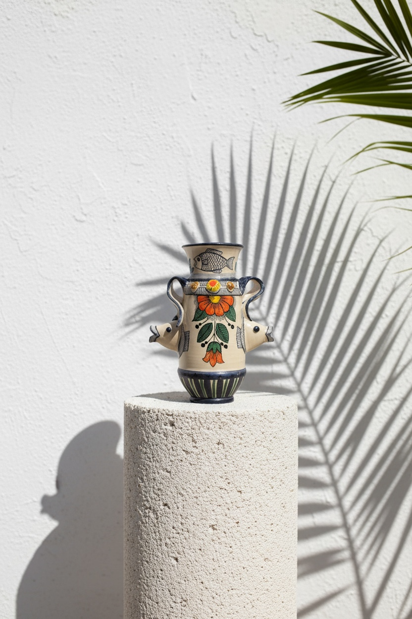 El Jarrón Amphitrite es una de las piezas más esculturales de la colección, diseñada por Sete Morueco. Esta obra desafía la forma tradicional incorporando elementos marinos en relieve que rompen la silueta, fusionándose con un vibrante motivo floral central. Es un diálogo entre el mar y la tierra, donde la cerámica cobra vida tridimensional.