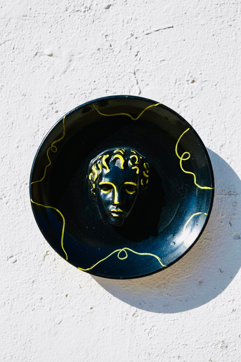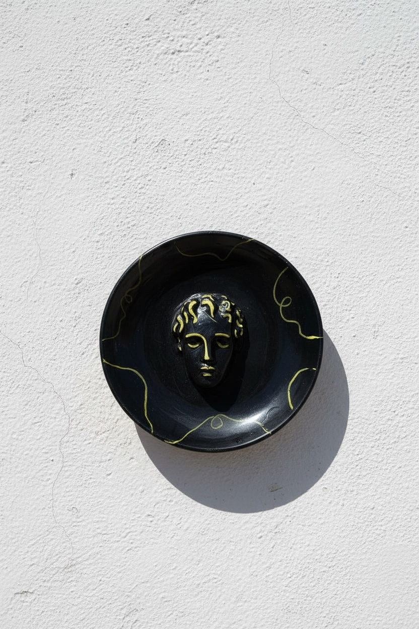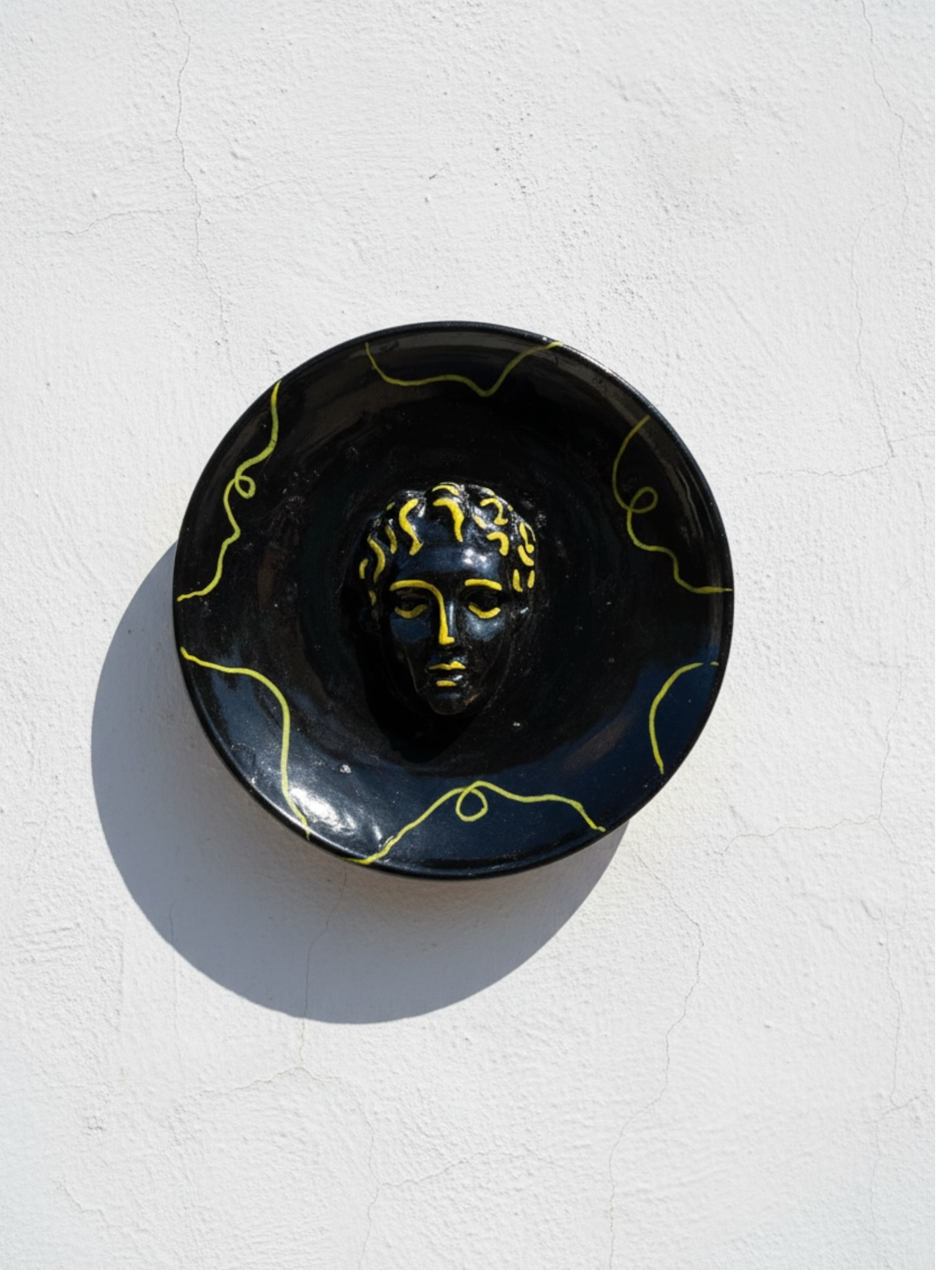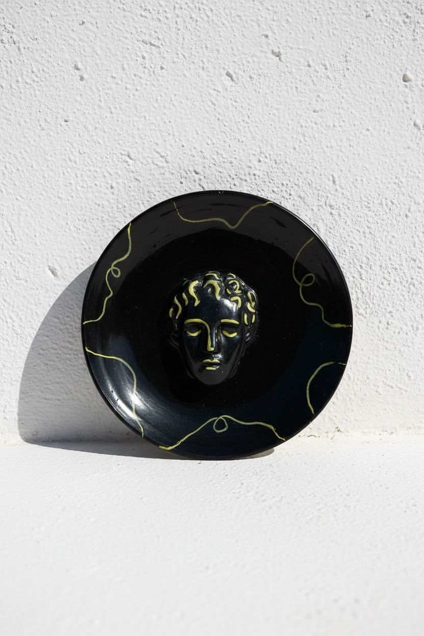 Plato decorativo de cerámica con la cabeza de Apolo integrada en el centro. Superficie esmaltada y trazos lineales pintados a mano en el borde. Preparado para colgar en pared.